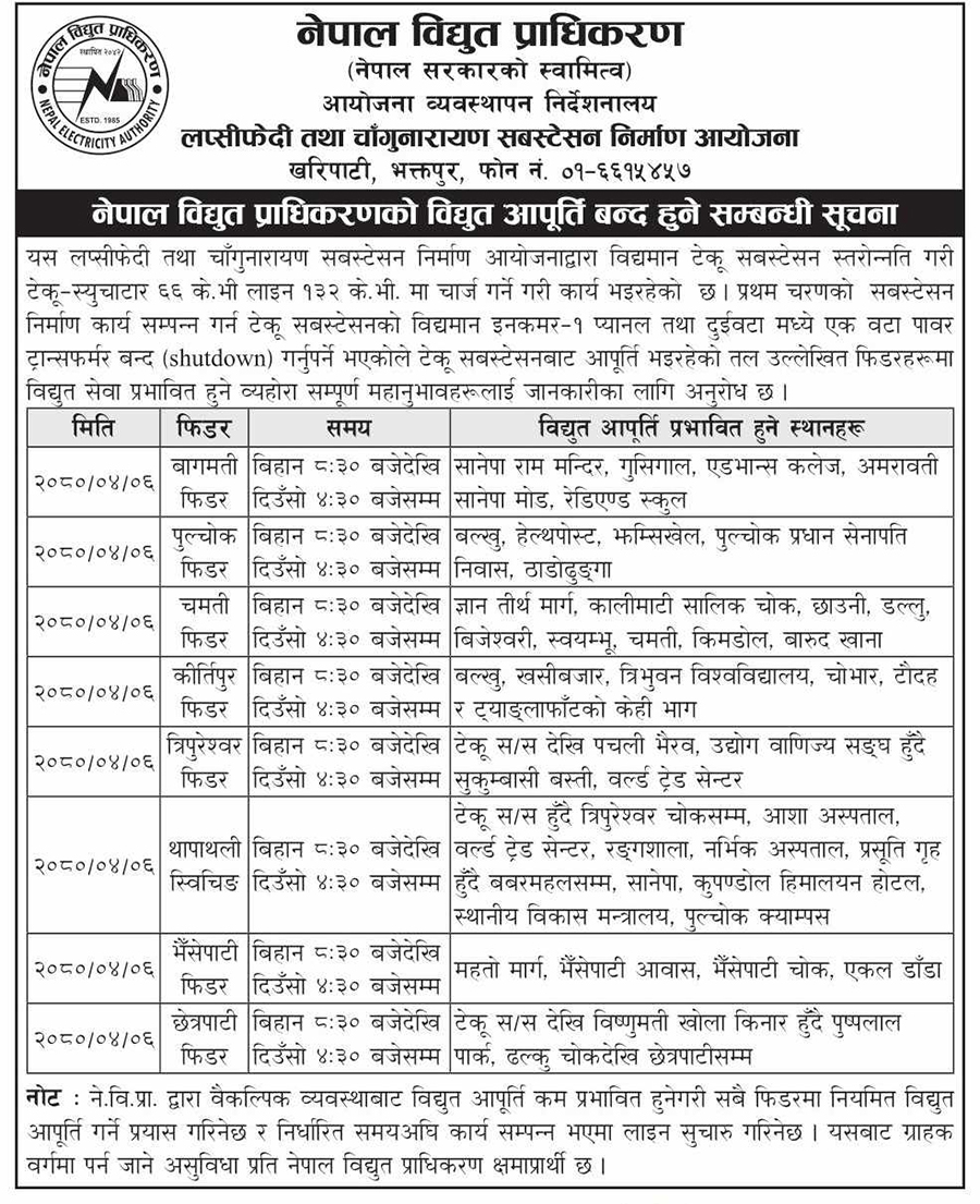 सूचनाअनुसार बागमती फिडरअन्तर्गत त्यस दिन सानेपा राममन्दी, गुसिंगाल, एडभान्स कलेज, अमरावती सानेपामा मोड, रेडियन्ट स्कुल क्षेत्रमा विद्युत् अवरुद्ध हुनेछ।