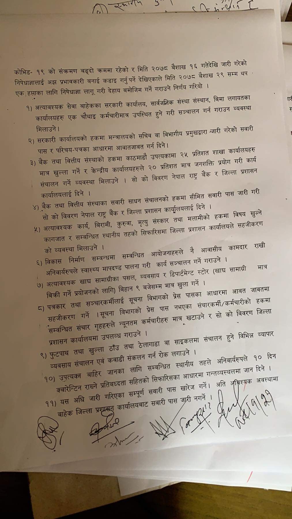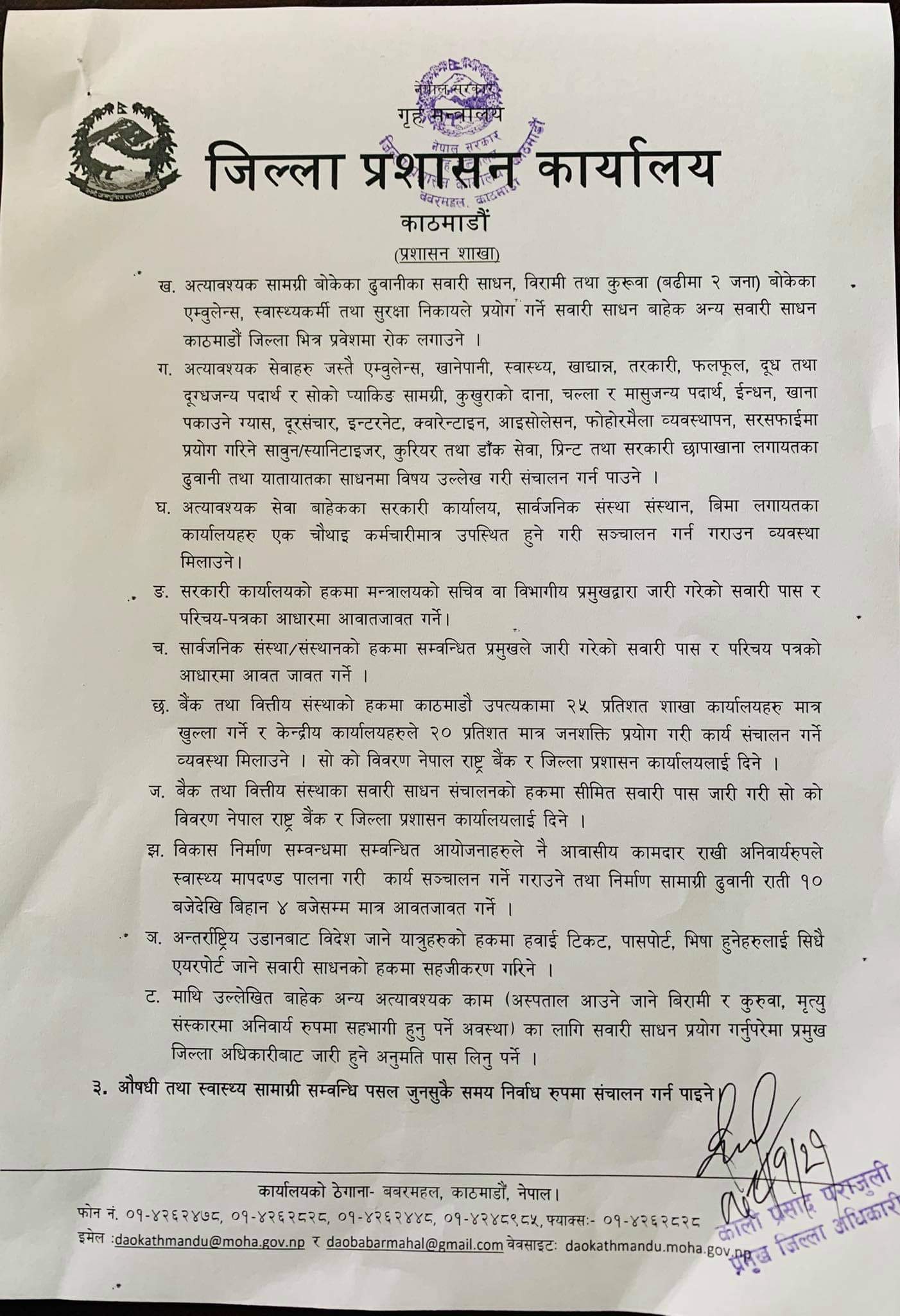 निषेधाज्ञामा बैंक तथा वित्तिय संस्थाहरूलाई आलोपालो गरि न्यूनतम् संख्यामा कर्मचारी राखेर चलाउने, पत्रकारहरूलाई पनि कडाइ गर्ने र उपभोग्य सामग्रीको पर्याप्तता, औषधी उपचारको व्यवस्थापनमा प्रशासनले सहजता प्रदान गर्ने बताइएको छ।