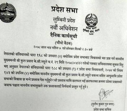 प्रदेश सभा सचिवालयले जारी गरेको कार्यसूचीमा संविधानको धारा १८८ को उपधारा १ र प्रदेशसभा नियमावली २०७४ को नियम १४३ को उपनियम ४ बमोजिम मुख्यमन्त्रीले वक्तव्यसहित आफूमाथि प्रदेशसभामा विश्वासको मत छ भन्ने प्रस्ताव पेश गर्ने र सो प्रस्तावमाथि छलफल गरी सभामुखले निर्णयार्थ प्रस्तुत गर्ने उल्लेख गरिएको छ ।
