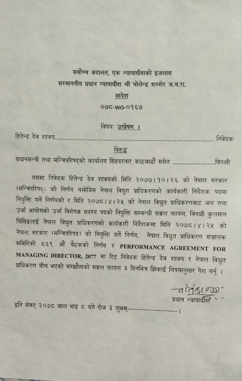 साथै इजलासले हितेन्द्रदेव शाक्यलाई विद्युत विकास निगममा लैजान गरिएको निर्णयको प्रति पनि झिकाउने आदेश दिएको छ ।