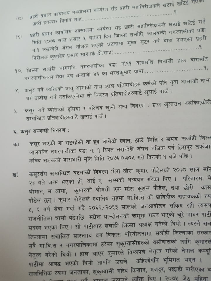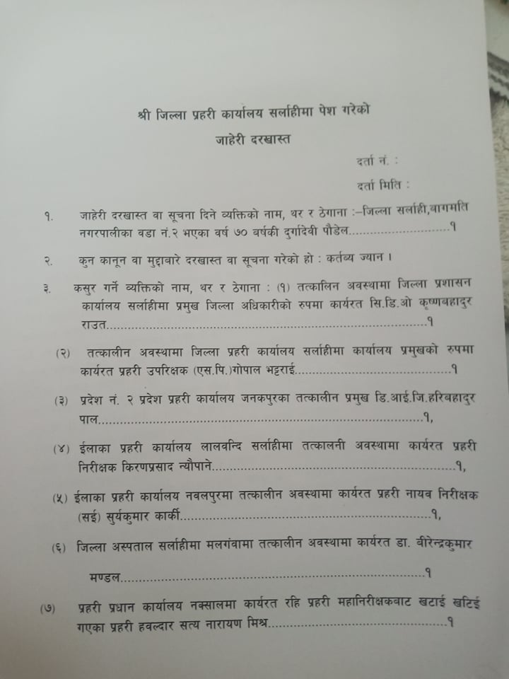 बिहीबार कुमारकी आमा ७० वर्षीय दुर्गादेवी पौडेलले तत्कालीन प्रमुख जिल्ला अधिकारी कृष्णबहादुर राउत, जिल्ला प्रहरी प्रमुख एसपी गोपाल भट्टराईसहित १० जनाका नाममा जिल्ला प्रहरी कार्यालय सर्लाहीमा किटानी दर्ता गरेकी हुन् ।