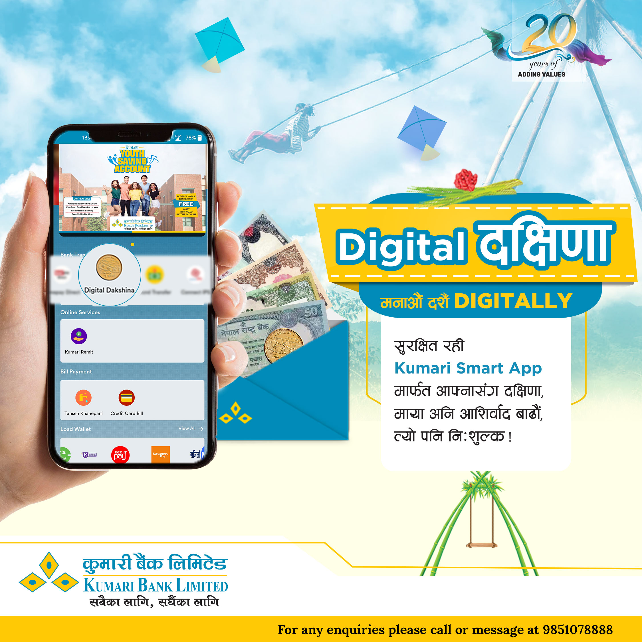 काठमाण्डु –  कुमारी बैंकले नेपालीहरुको महान चाड बडा दसैँको उपलक्ष्यमा ‘डिजिटल दक्षिणा’ अभियान ल्याएको छ । डिजिटल बैंकिंग क्षेत्रमा अग्रणी स्थानमा रही नवीनतम प्रविधिद्वारा सेवासुविधा प्रदान गर्दै आइरहेको कुमारी बैंकले नेपालीहरुको महान चाड बडा दशैंको उपलक्ष्यमा “डिजिटल दक्षिणा” अभियान ल्याएको हो ।