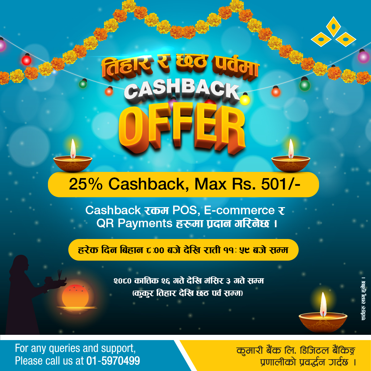 नेपाली बैंकिङ्ग क्षेत्रमा अग्रपंक्तिमा रहेको कुमारी बैंक लिमिटेडले ‘क्यासब्याक अफर’ योजना ल्याई तिहार र छठको हर्षोल्लासका अभिवृद्धि गर्ने भएको छ । यस योजनामा हरेक दिन पहिलो ५० जनालाई मोबाइल बैंकिङ्ग मार्फत क्यूआर र पहिलो ५० जनालाई कार्डबाट भुक्तानि कारोबार गर्दा बैंकद्वारा २५% अधिकतम ५०१ रुपैया सम्म क्यासब्याक दिइने छ ।