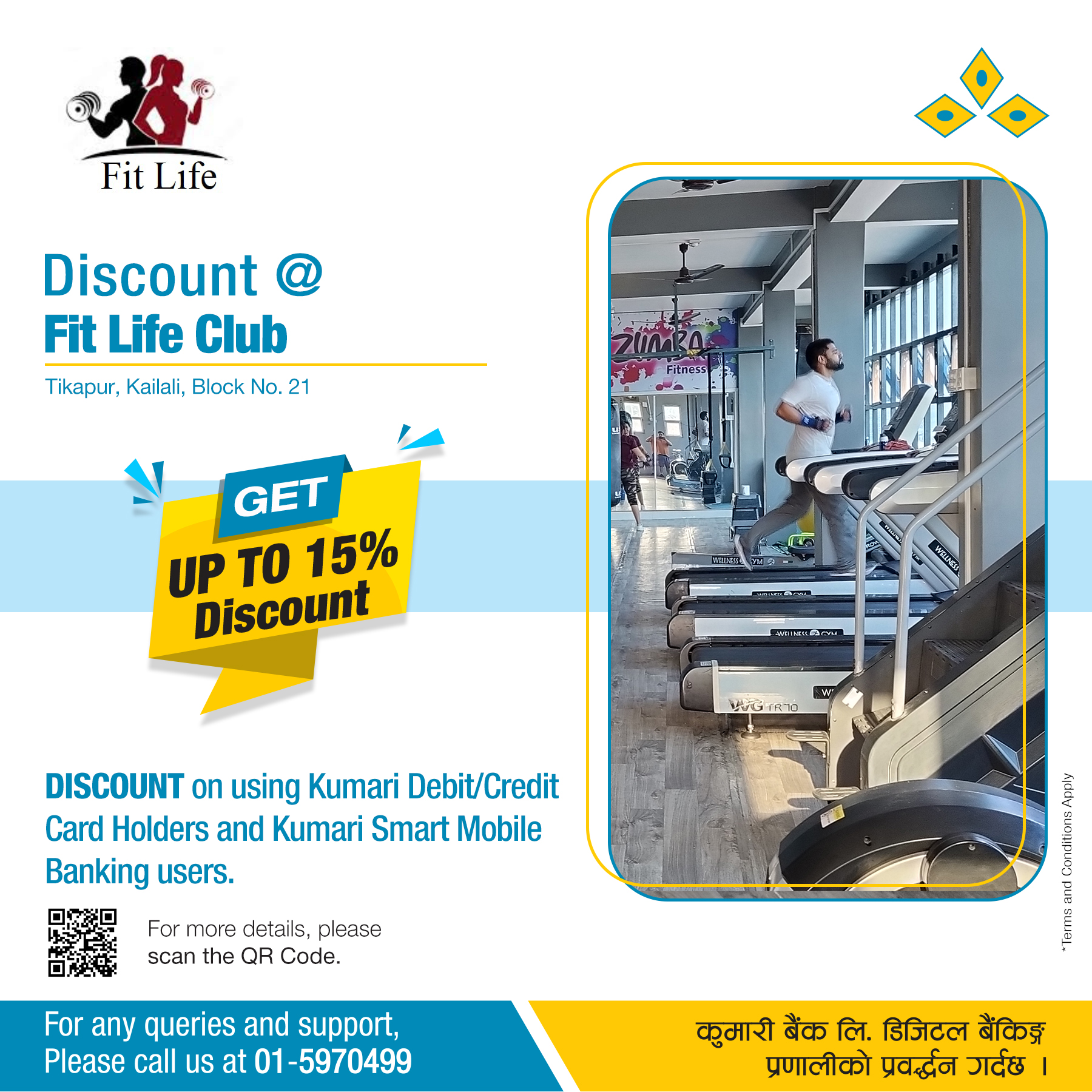 यस सम्झौताअनुसार कुमारी बैंक लिमिटेडका ग्राहक महानुभावहरुले सो फिट लाईफ क्लबबाट सेवा लिए बापत कुनै पनि भुक्तानी कुमारी बैंकको डेबिट\क्रेडिट कार्ड किउआरद्वारा गर्दा टिकापुर, कैलालीमा रहेको सो क्लबमा १५% छुट प्राप्त गर्न सक्नेछ ।