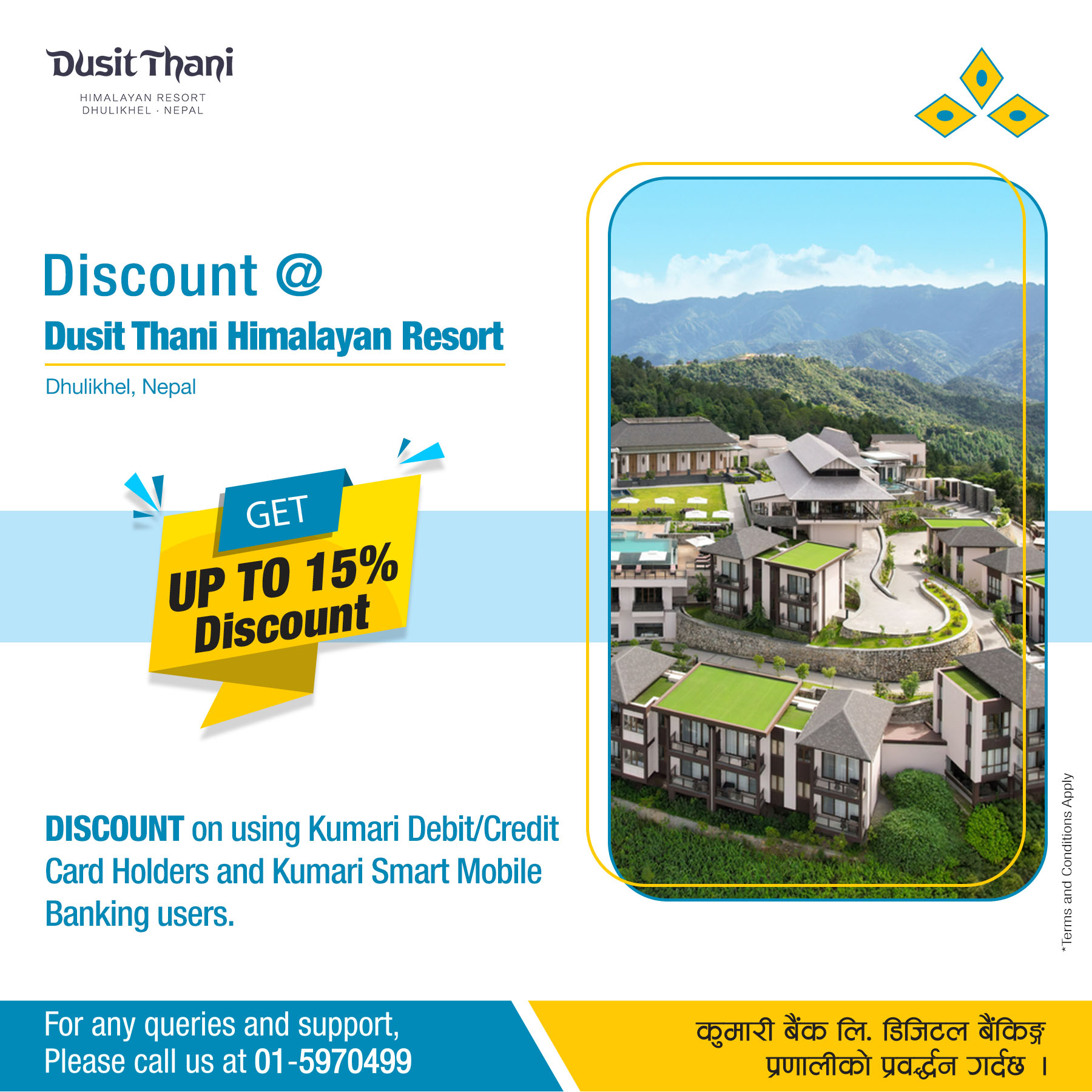 काठमाण्डु– कुमारी बैंक लिमिटेड र धुलिखेल स्थित दुसित ठानी हिमालयन रिसोर्ट बीच कुमारी बैंक लिमिटेडका ग्राहक महानुभावहरुलाई रिसोर्टबाट प्रदान गरिने सेवाहरुमा विशेष छुट प्रदान गर्ने सम्झौता भएको छ ।