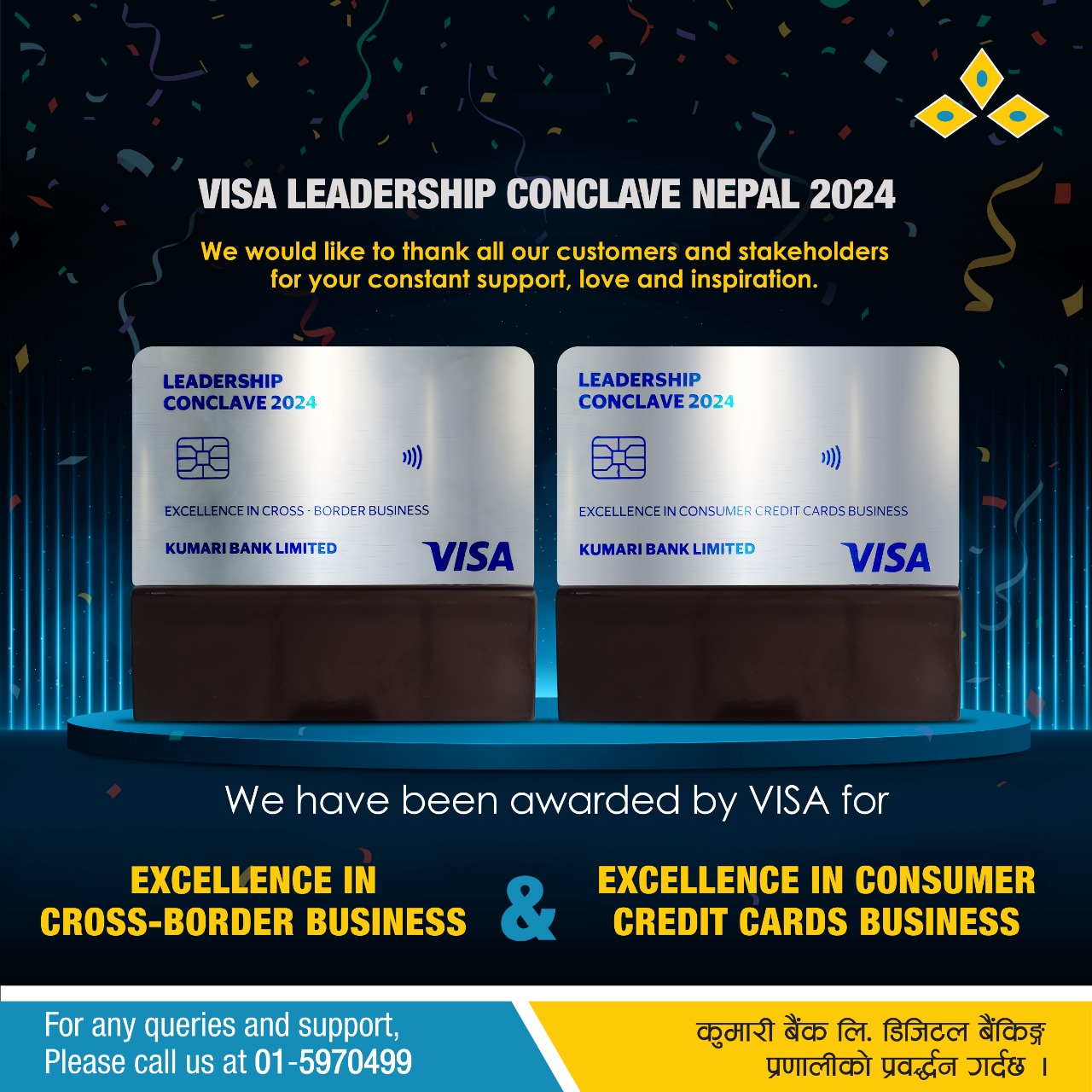 गत अशोज २ गते भिजा इन्टरनेशनलद्वारा आयोजित लिडर कन्सलेभ सम्मेलनमा एक्सलेन्ट इन कन्जुमर क्रेडीट कार्ड बिजनेस र एक्सलेन्ट इन क्रस बोर्डर बिजनेस अवार्डबाट सम्मानित भएको हो ।