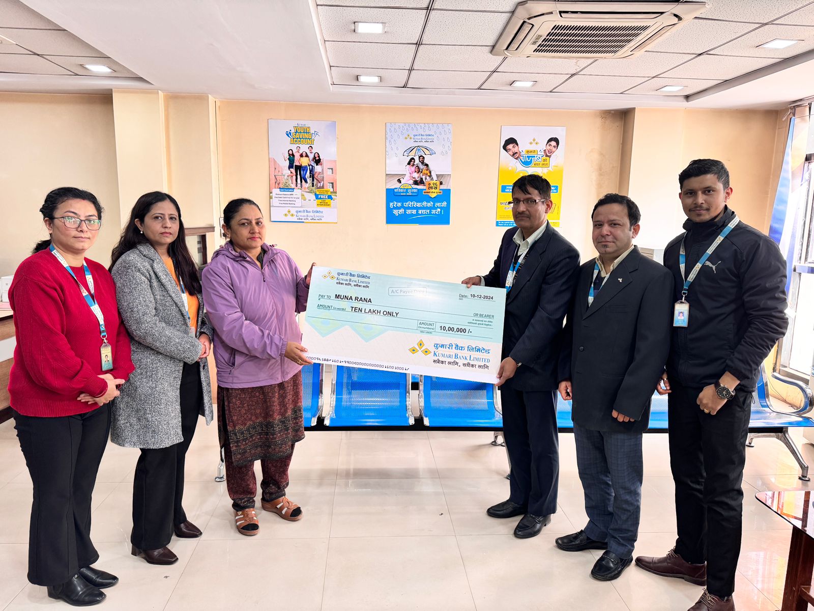 काठमाण्डु – कुमारी बैंक लिमिटेडले “कुमारी परिवार सुरक्षा बचत खाता” योजना अन्तर्गत खातावालाको परिवारलाई १० लाख रुपैयाँको दुर्घटना बीमा रकम भुक्तानी गरेको छ ।