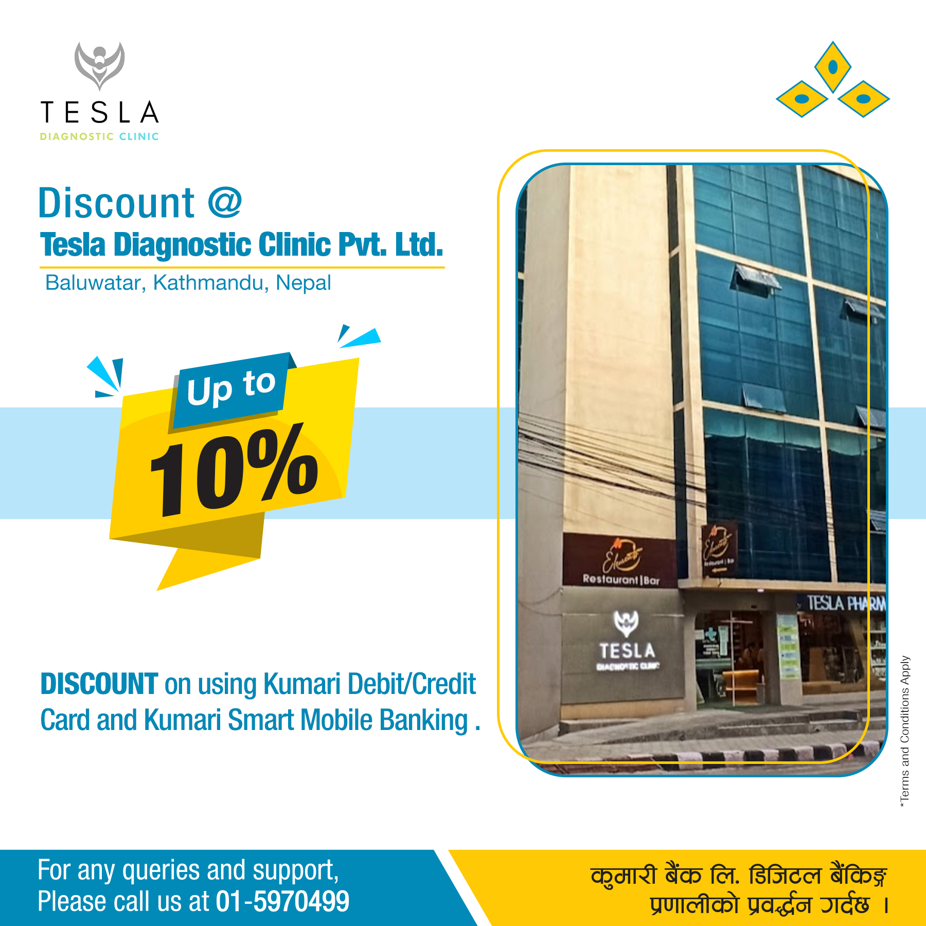 काठमाण्डु– कुमारी बैंक लिमिटेड र बालुवाटार, काठमाडौं स्थित टेस्ला डायग्नोस्टिक क्लिनिक प्रा.लि. बिच कुमारी बैंक लिमिटेडका ग्राहक महानुभावहरुलाई सो क्लिनिकबाट प्रदान गरिने विभिन्न सेवाहरुमा विशेष छुट प्रदान गर्ने सम्झौता भएको छ ।