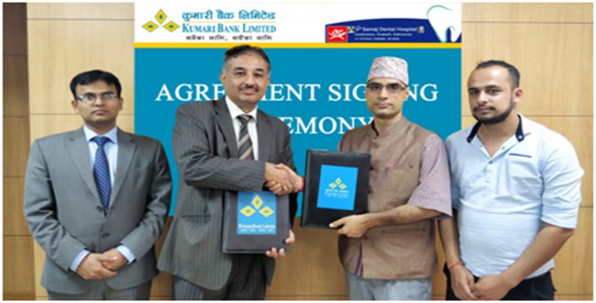 कुमारी बैंकका नायव प्रमुख कार्यकारी अधिकृत राजीव गिरी र ओम समाज डेन्टल हस्पिटलका अध्यक्ष तथा वरिष्ठ दन्तरोग विशेषज्ञ डा. सुवास घिमिरेको हस्ताक्षर गरेका छन् । उक्त सम्झौतापत्र अनुसार ओम समाज डेन्टल हस्पिटलका विभिन्न स्वास्थोपचार सेवा शुल्कमा ग्राहकवर्गले कुमारी बैंकको डेबिट तथा क्रेडिट कार्डमार्फत भुक्तानी गर्दा १५ प्रतिशतसम्मको आकर्षक छुट प्राप्त गर्न सक्ने बैंकले जनाएको छ ।