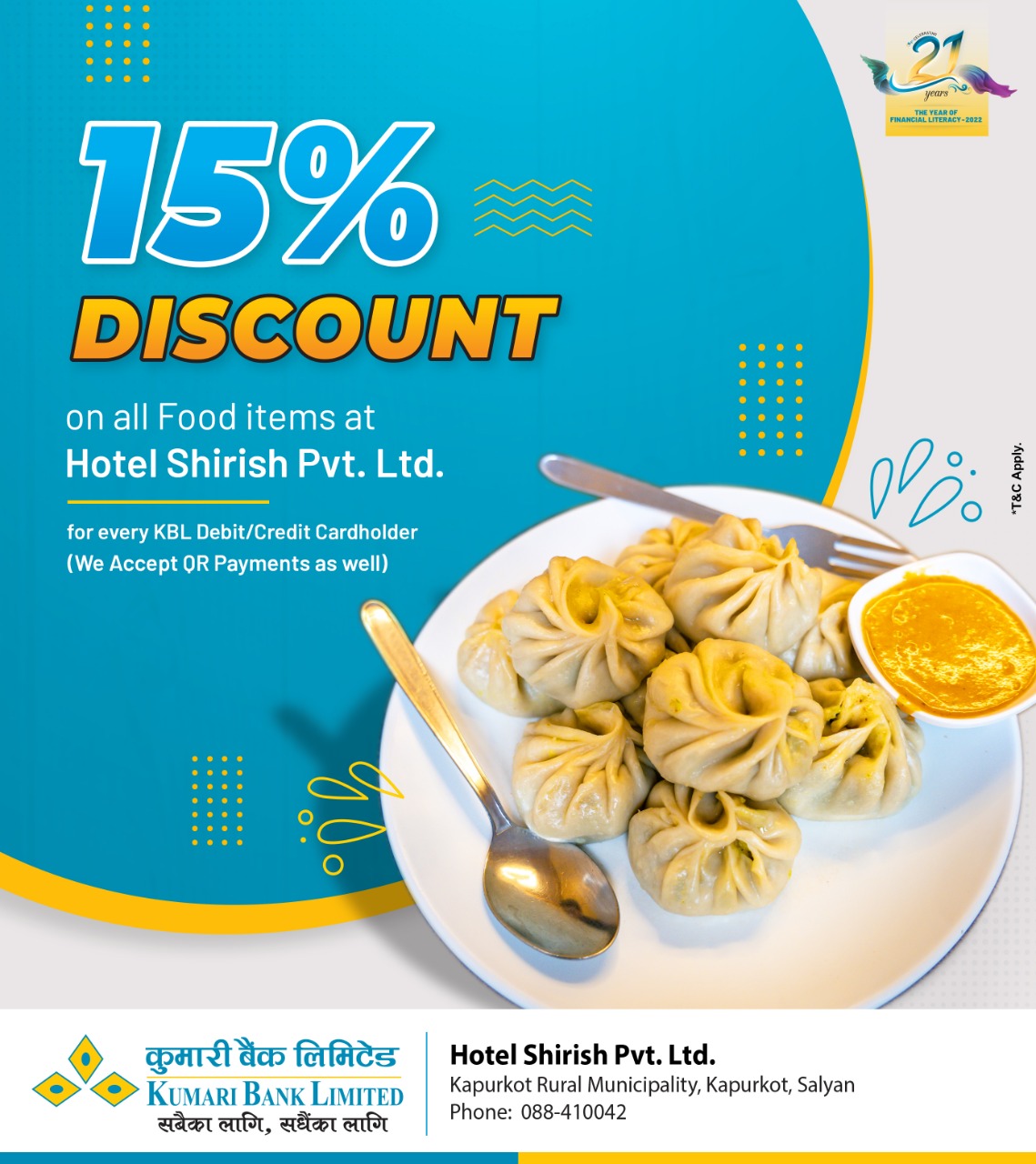 कपुरकोट नगरपालिका, वडा नम्बर ०३, सल्यानस्थित होटेल शिरीषबीच कुमारी बैंक लिमिटेडका ग्राहकहरुलाई होटेल शिरीषबाट प्रदान गरिने सेवाहरुमा विशेष छुट प्रदान गर्ने समझदारी भएको हाे ।