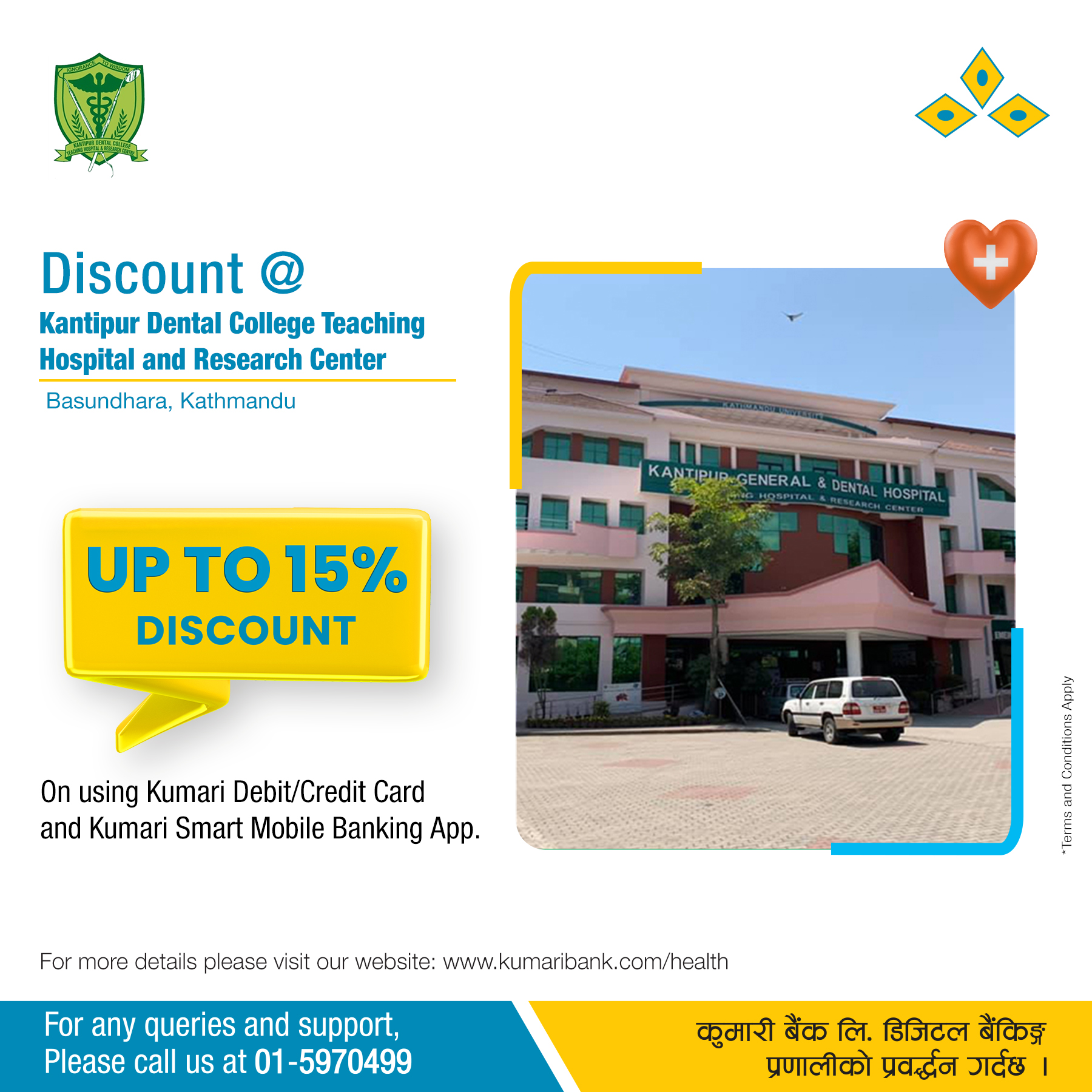 यस सम्झौता अनुसार कुमारी बैंक लिमिटेडका ग्राहकहरुले सो कान्तिपुर डेन्टल कलेज टिचिङ्ग अस्पतालबाट सेवा लिए बापत कुनै पनि भुक्तानी कुमारी बैंकको डेबिट-क्रेडिट कार्डबाट गर्दा ओपिडि सामान्य डेन्टल सेवाहरूमा कान्तिपुर डेन्टल कलेज टिचिङ्ग अस्पताल तथा रिसर्च केन्द्र, काठमाडौं मूख्य कार्यालय तथा नारायणगढर बुटवलमा रहेका शाखा कार्यालयहरुबाट सेवा लिदा १० प्रतिशत, विशेष डेन्टल सेवाहरूमा ७ प्रतिशत लाग्नेछ ।