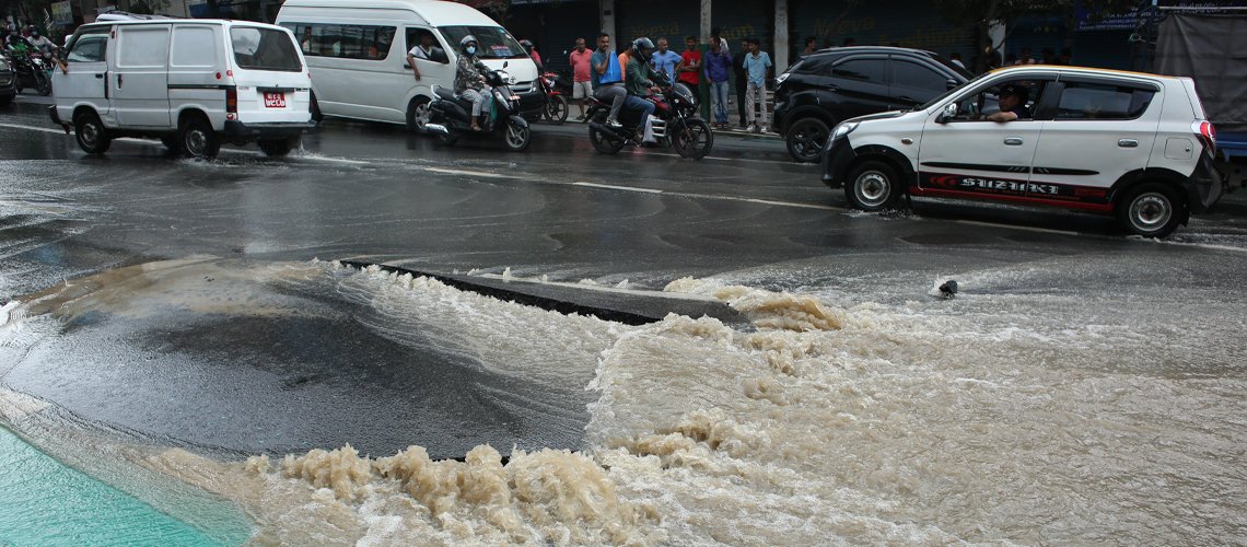 कुपण्डोलको होटल हिमालय अगाडि इन्जिनीयरिङ कलेज पस्ने दोबाटो छेउमा सडक भ्वाङ परेर पानी निस्केको छ ।