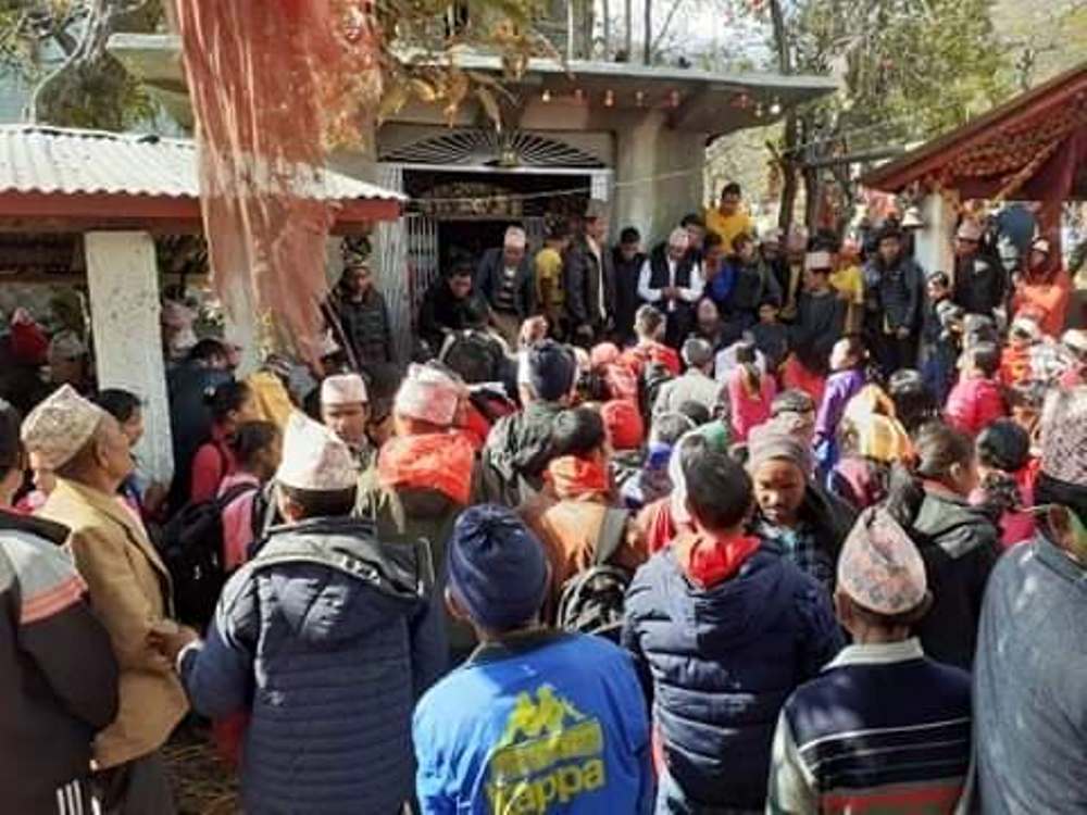 काडागाइ भनिने दौल्याल परिवारको पुजारीले सिङ्गो सुख ढाल्नुपर्छ । त्यो सिङ्गो रुखलाइ नै नबिगारिकन नभाचिकन जस्ताको तेस्तै ल्याउने प्रचलन छ । यो बर्ष श्रीपञ्चमी पनिसंगै परेकाले यो मन्दिरमा हुम लगाउने र ५०÷६० भन्दा बढी बोकाको बलि दिने चलन पनि छ ।