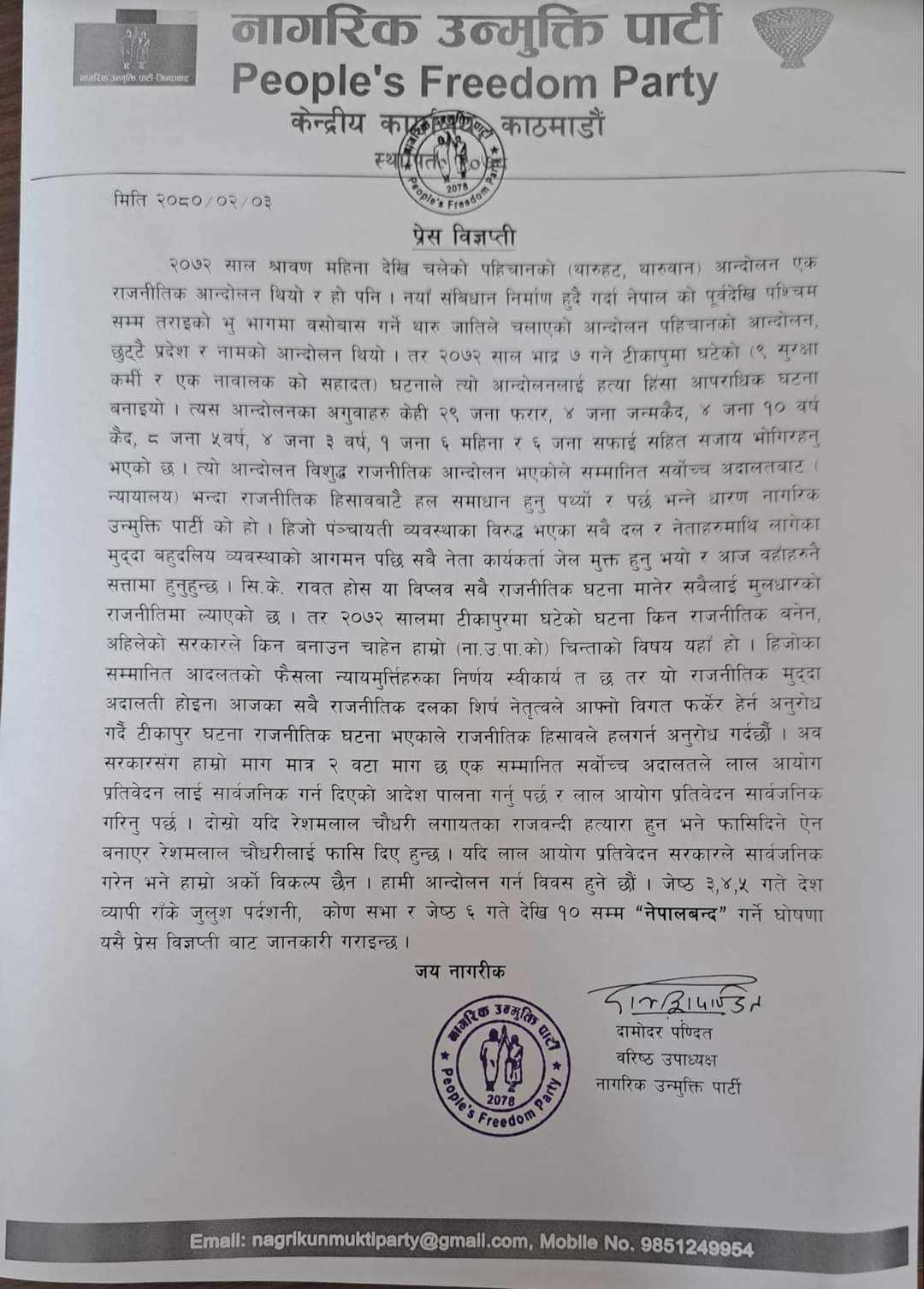 टीकापुर आन्दोलन विशुद्ध राजनीतिक आन्दोलन भएको पनि नागरिक उन्मुक्ति पार्टीले जनाएको छ । पण्डितले जारी गरेको विज्ञप्तिमा भनिएको छ, ‘त्यो आन्दोलन विशुद्ध राजनीतिक आन्दोलन भएकाले सम्मानित सर्वोच्च अदालतबाट(न्यायलय)भन्दा राजनीतिक हिसाबबाटै हल समाधान हुनुपर्थ्यो र पर्छ भन्ने धारणा नागरिक उन्मुक्ति पार्टीको हो ।’ नागरिक उन्मुक्ति पार्टीले विगतमा थुप्रै घटनालाई राजनीतिक आन्दोलनका रूपमा लिइएको जनाएको छ ।