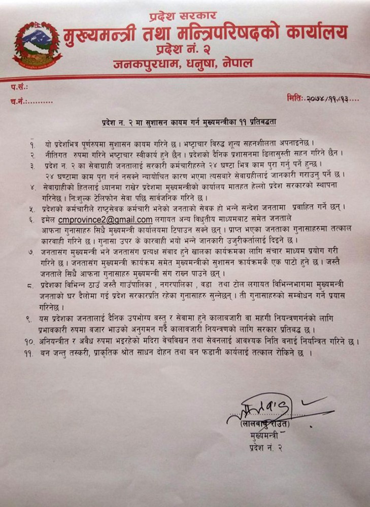 काठमाडौं– प्रदेश २ का मुख्यमन्त्री लालबाबु राउतले ११ बुँदे प्रतिबद्धता व्यक्त गरेका छन्।