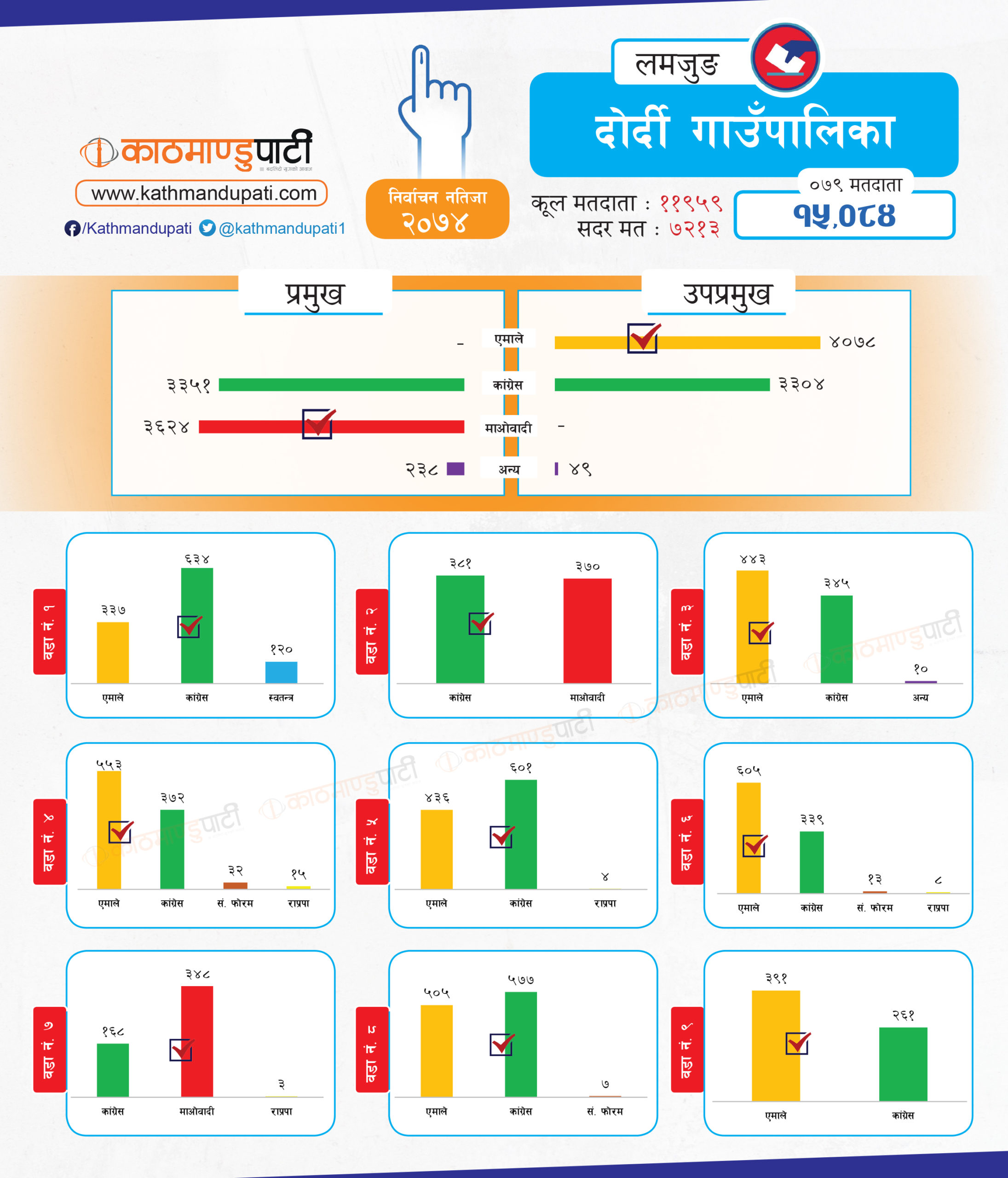 माओवादी केन्द्रले दोर्दी गाउँपालिका जितेको थियो । यो पालिकामा माओवादी उम्मेदवारले ३ हजार ६ सय २४ मत ल्याएर जितेका थिए भने कांग्रेसका उम्मेदवारले ३ हजार ३ सय ५१ मत ल्याएका थिए । यहाँ जितहारको मतान्तर २ सय ७३ छ । उपाध्यक्ष भने एमालेले जितेको थियो । माओवादी अहिले यो पालिका जोगाउने रणनीतिमा छ । लमजुङ माओवादी नेता देव गुरुङको गृहजिल्ला पनि हो । स्थानीय निर्वाचनका लागि जिल्लामा १ लाख ३१ हजार ४ सय ९४ मतदाता छन् । यीमध्ये ६४ हजार ४१ पुरुष र ६७ हजार ४ सय ५३ महिला छन् ।