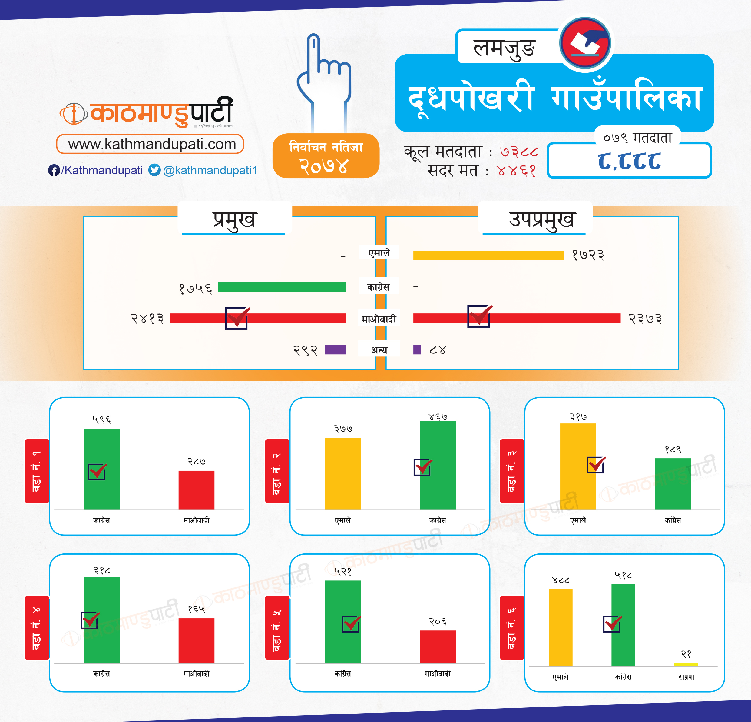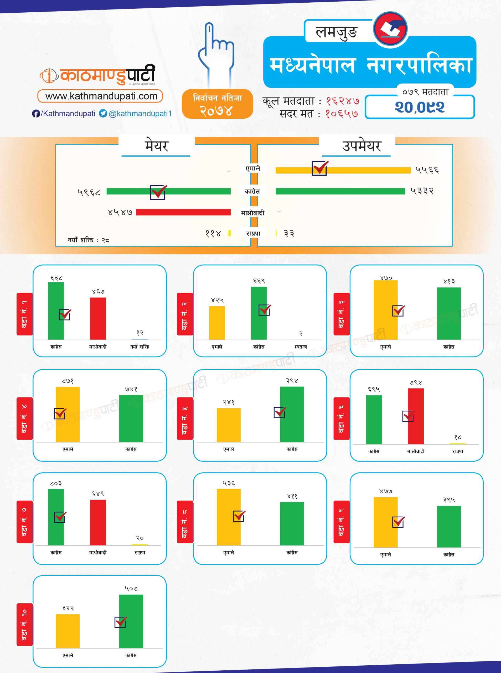 कांग्रेसले मध्यनेपाल नगरपालिका र दूधपोखरी गाउँपालिका जितेको थियो । मध्यनेपाल नगरपालिका प्रमुख पदमा कांग्रेसका उम्मेदवारले ५ हजार ९ सय ६८ मत ल्याएका थिए भने माओवादी उम्मेदवार ४ हजार ५ सय ४७ मत ल्याएर पराजित भएका थिए । उपप्रमुख भने एमालेले जितेको थियो । दूधपोखरी गाउँपालिकामा कांग्रेसका उम्मेदवारले २ हजार ४ सय १३ मत ल्याएका थिए भने माओवादी उम्मेदवार १ हजार ७ सय ५६ मत ल्याएर पराजित भएका थिए ।