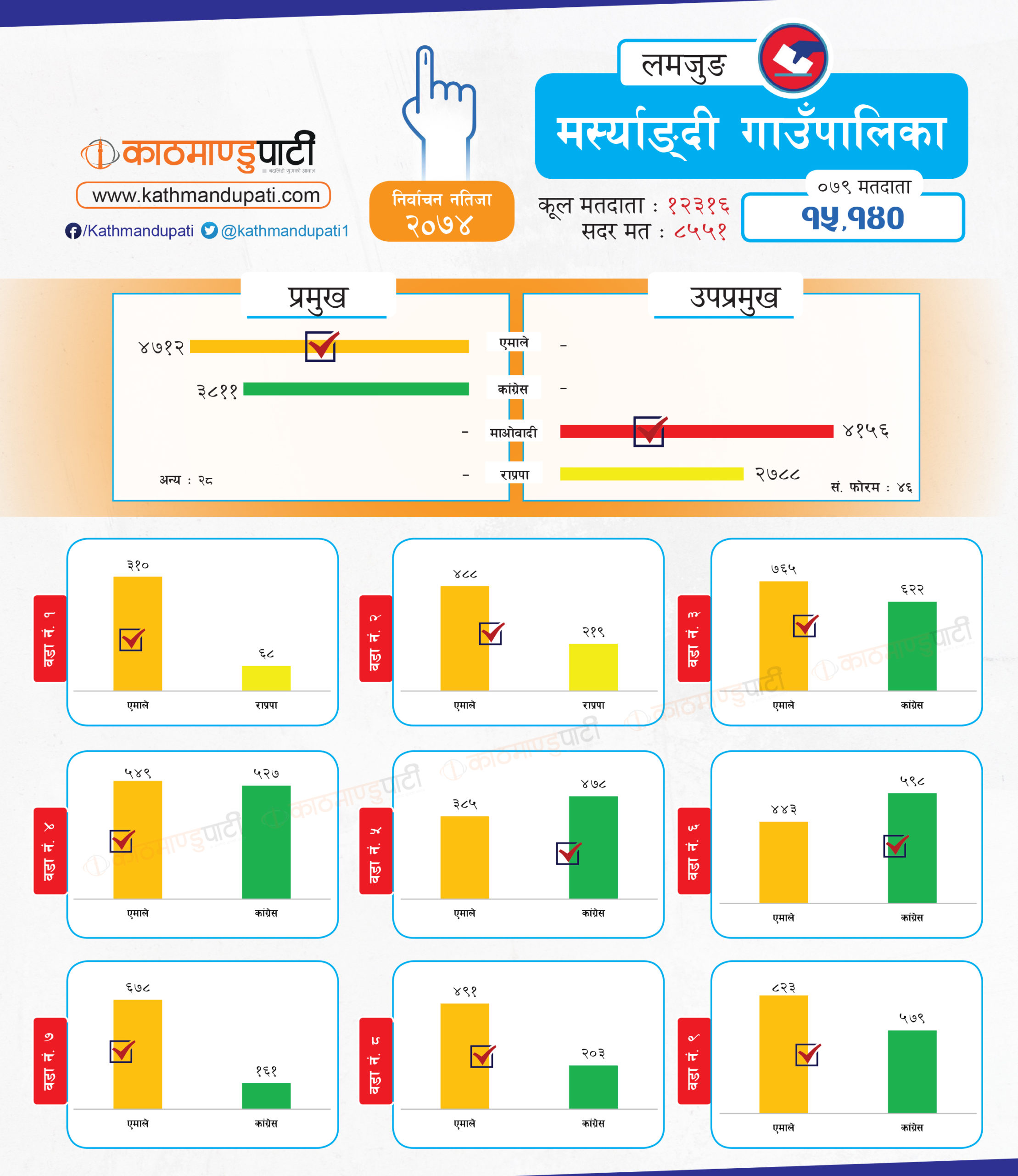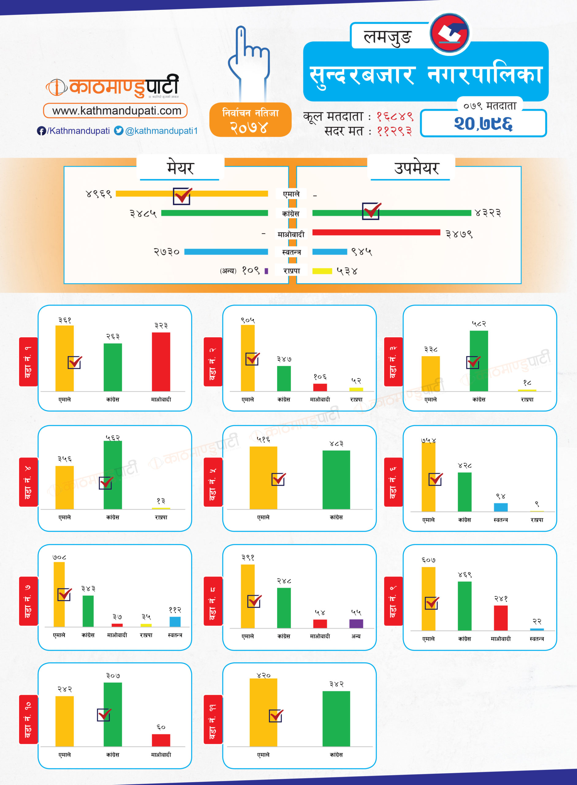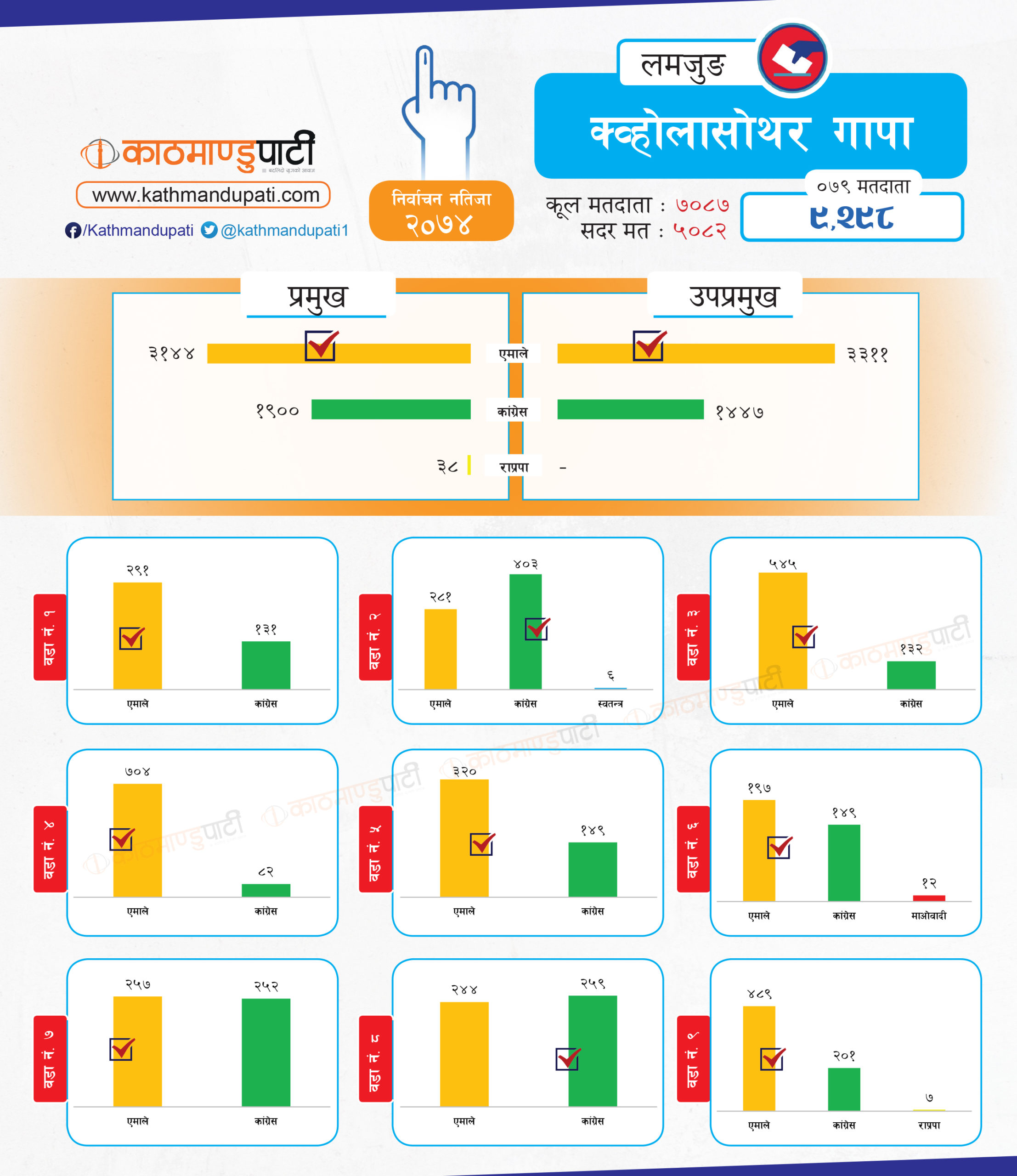 सुन्दरबजार नगरपालिका प्रमुख पदमा एमालेका उम्मेदवारले ४ हजार ९ सय ६९ मत ल्याएका थिए भने कांग्रेसका उम्मेदवारले ३ हजार ४ सय ८५ मत ल्याएका थिए । यहाँ पनि उपप्रमुख कांग्रेसले जितेको थियो । क्व्होलासोथर गाउँपालिका अध्यक्ष पदमा एमालेका उम्मेदवार ३ हजार १ सय ४४ मत ल्याएर विजयी भएका थिए भने कांग्रेसका उम्मेदवार १ हजार ९ सय मत पाएका थिए । मस्र्याङ्दी गाउँपालिका अध्यक्ष पदमा एमालेका उम्मेदवारले ४ हजार ७ सय ७१ मत ल्याएका थिए भने कांग्रेसका उम्मेदवारले ३ हजार ८ सय ११ मत ल्याएका थिए ।