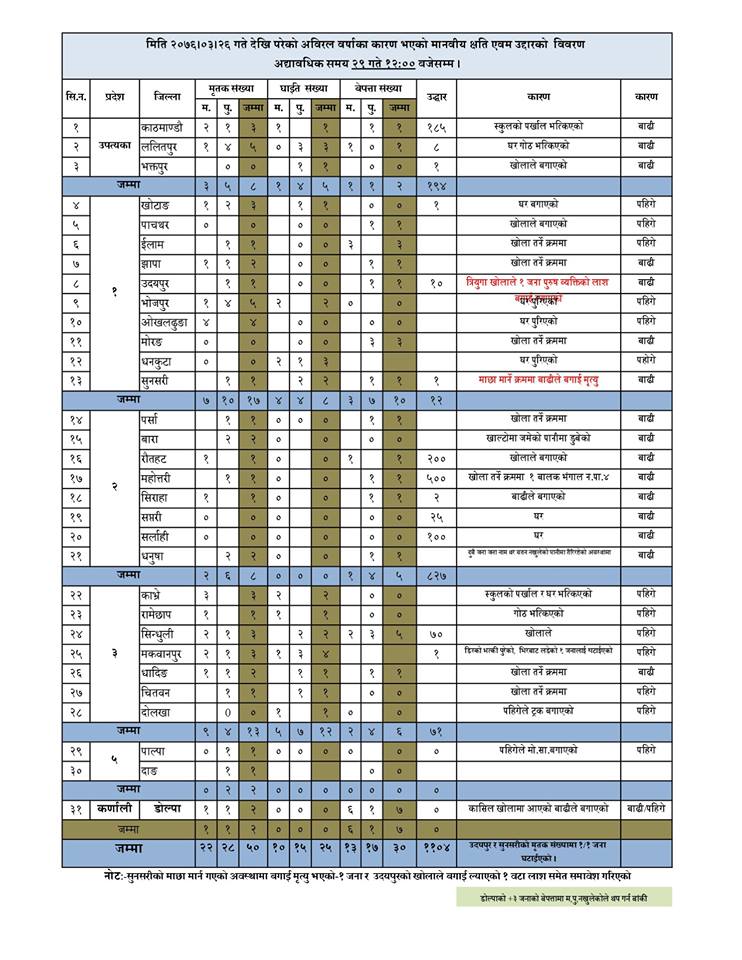 २५ जना घाइत रहेका छन् भने ३३ जना बेपत्ताको खोजी भरहेको जनाइएको छ ।  प्रहरीका अनुसार १३ महिला र १७ पुरुष गरी जम्मा ३३ जना वेपत्ता भएका छन् भने हालसम्म ११०४ जनाको जिवितै उद्दार गरिएको छ ।यस्तै कर्णाली प्रदेशको डोल्पास्थित कासिल खोलाले बगाएर ११ जना बेपत्ता रहेको प्रहरी प्रधान कार्यालयले जनाएको छ।
