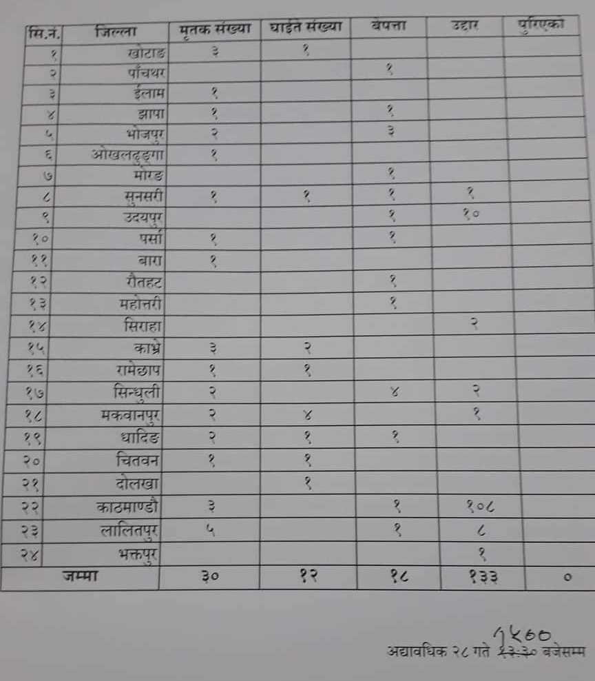 काठमाडौं – बाढीपहिरोमा परी देशभर अहिलेसम्म ३० जनाको मृत्यु भएको छ। प्रहरी प्रधान कार्यालयका अनुसार १८ जना बेपत्ता भएका छन् भने १२ जना घाइते छन्।
