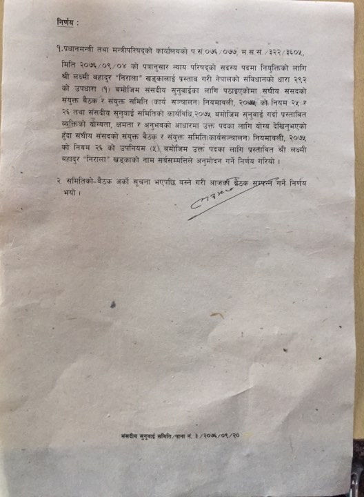 सरकारले निरालालाई न्याय परिषद् सदस्य पदमा गत पुस ३ गते सिफारिस गरेको थियो । अब राष्ट्रपतिले उनलाई नियुक्ति गर्नेछिन् ।