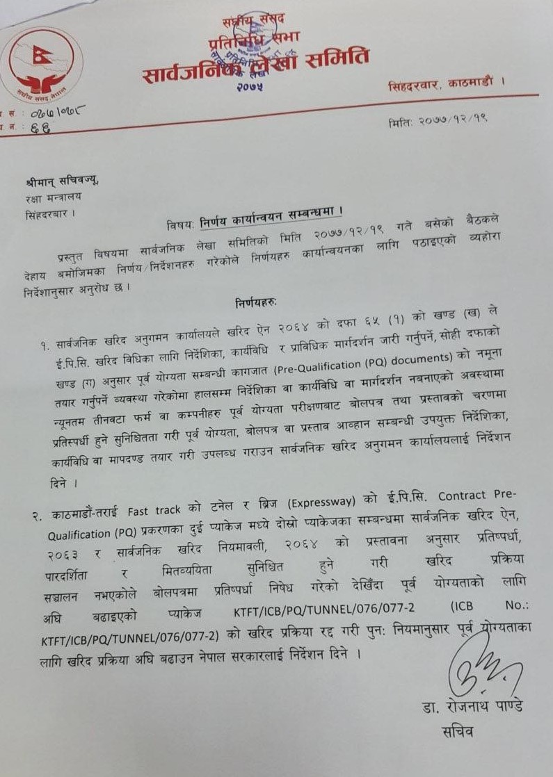 गत चैत १९ गतेको लेखा समितिको निर्णयमा उल्लेख छ, ‘काठमाडौं–तराई फास्ट ट्रयाकको टनेल र ब्रिजको ईपीसी, ठेक्का पूर्व योग्यता छनोट प्रकरणका दुई प्याकेजमध्ये दोस्रो प्याकेजका सम्बन्धमा सार्वजनिक खरिद ऐन २०६३ र सार्वजनिक खरिद नियमावली २०६४ को प्रस्तावना अनुसार प्रतिस्पर्धा, पारदर्शिता र मितव्ययिता सुनिश्चित हुने गरी खरिद प्रक्रिया सञ्चालन नभएकोले बोलपत्रमा प्रतिस्पर्धा निषेध गरेको देखिँदा पूर्व योग्यताको लागि अघि बढाइएको प्याकेज केटीएफटी\आईसीबी\पीक्यू\टनेल\२०७६\०७७–२ को खरिद प्रक्रिया रद्द गरी पुनः नियमानुसार पूर्व योग्यताका लागि खरिद प्रक्रिया अघि बढाउन नेपाल सरकारलाई निर्देशन दिने ।’