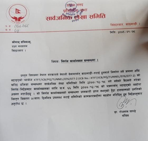 ‘निर्णय कार्यान्वयनको सम्बन्धमा जानकारी प्राप्त नभएको हुँदा हालसम्मको प्रगतिको विस्तृत विवरण ७ (सात) दिनभित्र उपलब्ध गराई समितिको काम कारवाहीमा सहयोग गरिदिनु हुन निर्देशनुसार अनुरोध छ,’ पत्रमा उल्लेख छ ।