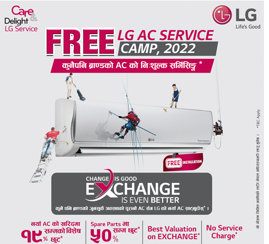 जुनसुकै ब्राण्डको पुरानो ए.सी. उचित मूल्याङकन सँग नयाँ एल.जी. ए.सि पनि साट्न सकिने छ । फ्रि सर्भिसको लागि ९८०३६२१९२४-९८६४४७५५६९ मा रजिष्ट्रेसन गराउनु पर्नेछ । यो योजना सिमित अवधिको लागि नेपाल अधिराज्यभरी लागु हुनेछ ।