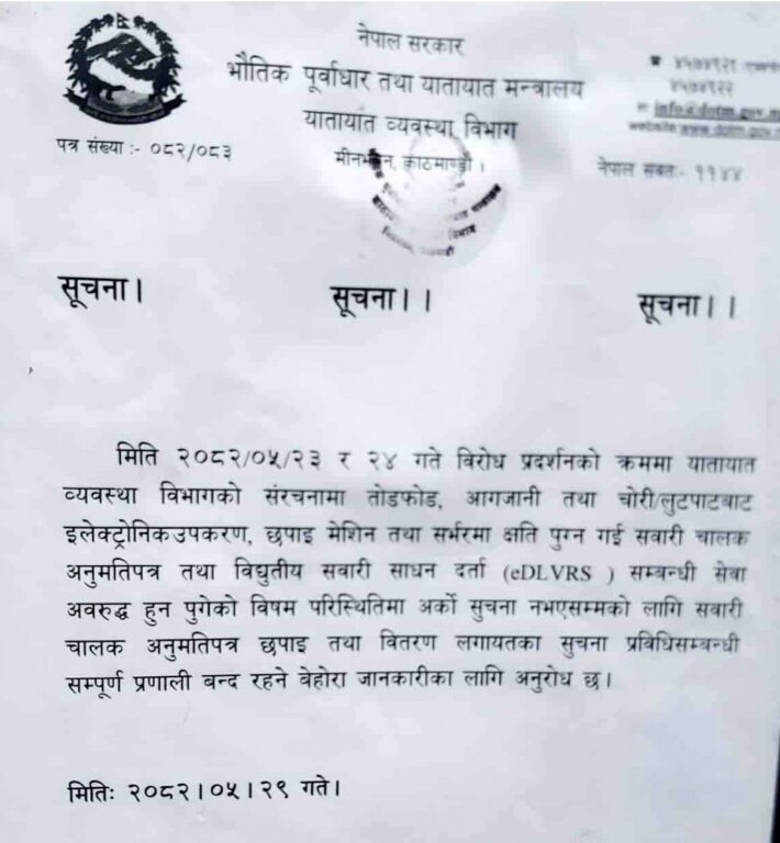 यसका कारण चालक अनुमतिपत्र तथा विद्युतीय सवारी साधन दर्ता (EDLVRS) सम्बन्धी सम्पूर्ण सेवा अवरुद्ध भएको र अर्को सूचना नआएसम्म सूचना प्रविधिसम्बन्धी सबै प्रणाली बन्द रहने विभागले जानकारी गराएको छ।