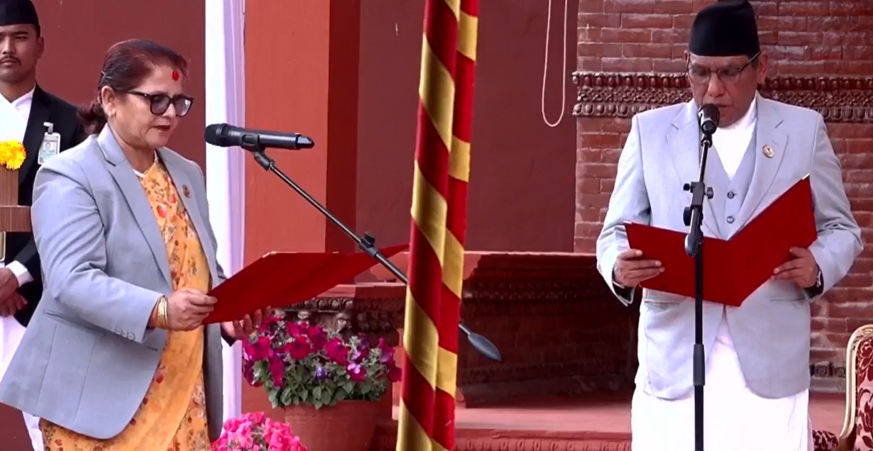 मंगलबार राष्ट्रपति कार्यालय शीतल निवासमा आयोजित समारोहबिच अध्यक्ष नारायणप्रसाद दाहालबाट शपथ ग्रहण गरेकी हुन् ।