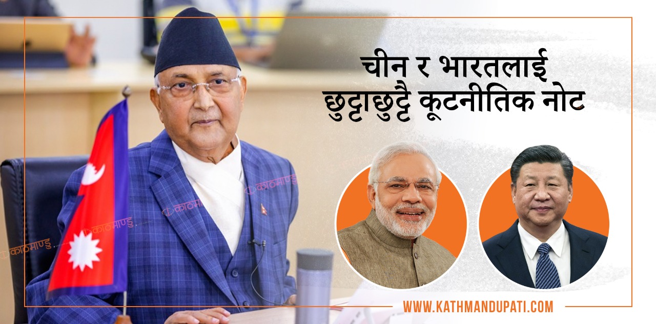 सरकारले चीन र भारतलाई छुट्टाछुट्टै कूटनीतिक नोट पठाएको छ । प्रधानमन्त्री केपी शर्मा ओलीले परराष्ट्र मन्त्रालयलाई कूटनीतिक नोट पठाउन निर्देशन दिएपछि मन्त्रालयले कूटनीतिक नोट पठाएको हो ।