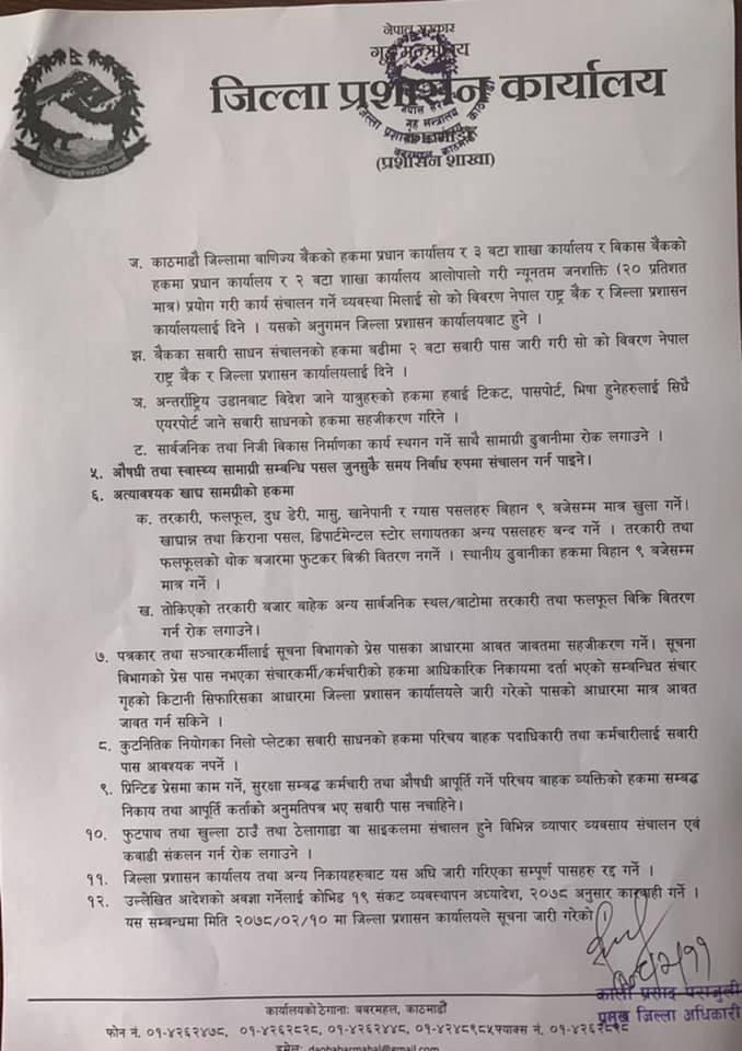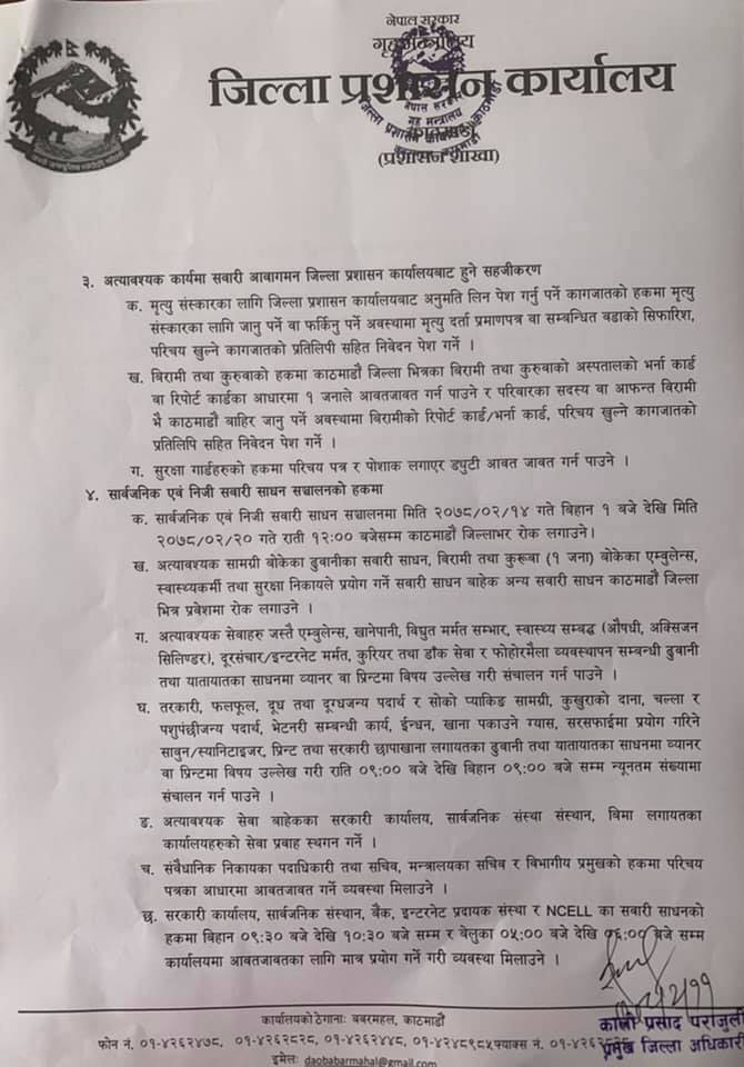 मंगलबार बसेको काठमाण्डु, ललितपुर र भक्तपुरका प्रमुख जिल्ला अधिकारीहरुको बैठकले निषेधाज्ञा २० गतेसम्म थप्ने निर्णयसँगै विकास निर्माणको काम पनि बन्द गर्ने निर्णय गरेको हो ।