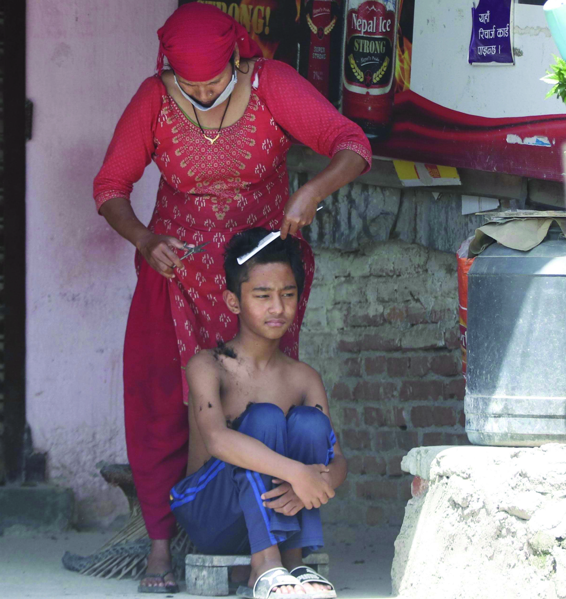 काठमाडौँ – काठमाडौँको कपनमा एक स्थानीय आमाले छोरोको कपाल काट्दै । बन्दाबन्दीका कारण नाउको पसल नखोलेका कारण छोरोका कपाल कट्न बाध्य भएको हो । तस्वीर /रोशन सापकोटा/रासस