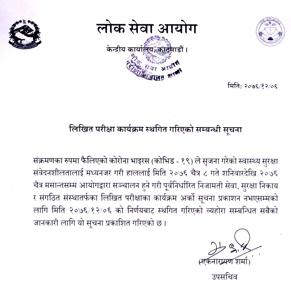 काठमाडौं – कोरोना भाइरसको संक्रमबाट जोगिन लोक सेवा आयोगले सबै लिखित परीक्षा स्थगित गरेको छ । आयोगले चैत ८ गतेपछिका सबै परीक्षा स्थगित गर्ने निर्णय गरेको हो ।