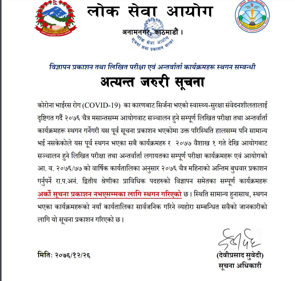 कोरोना भाइरसको कारण सिर्जना भएको विषम परिस्थितिलाई‌‌ मध्यनजर गर्दै २०७६ को चैत मसान्तसम्म हुने‌ लिखित र अन्तर्वार्ताका कार्यक्रम‌ स्थगनको पूर्व‌सूचना अनुसार ‌नै अर्को सूचना‌ प्रकाशन नभएसम्म‌ स्थगित भइसकेका छन् ।