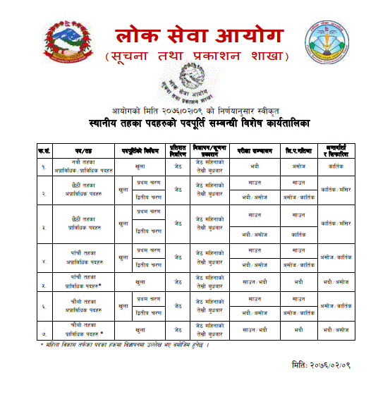 कार्यतालिकाअनुसार चौथो, पाँचौँ, छैटौँ र नवौँ तहसम्मका विभिन्न प्राविधिक तथा अप्राविधिक पदमा खुला प्रतिस्पर्धाका लागि विज्ञापन आह्वान गरिनेछ ।