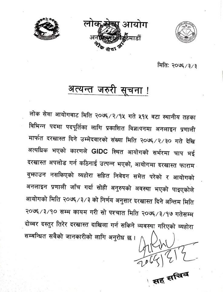 जेष्ठ ३० गतेदेखि आयोगको सर्भरमा चाप भई आवेदकले दरखास्त दिन नसकेको भन्दै आवेदन फारम भर्न नपाएका आवेदकहरुको लोकसेवामा निवेदन परेपछि सोहीअनुरुप लोकसेवाले असार १० गतेसम्मलाई आवेदन फारम भर्ने म्याद थप गरेकाे र दोब्बर दस्तुर तिरेर १७ गतेसम्म दरखास्त दिन सकिने लोकसेवाले जनाएको छ ।