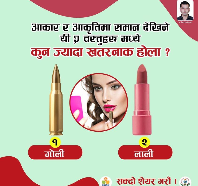 ८. क्यानसरः लिपस्टिकमा प्रयोग गरिएका विभिन्न तत्वहरूले क्यानसर गराउनपनि सक्दछ ।