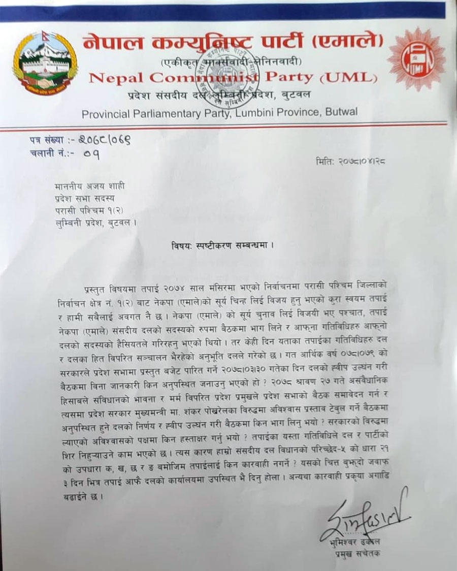 ‘मुख्यमन्त्री शंकर पोखरेलविरुद्धमा अविश्वास प्रस्ताव टेबुल गर्ने बैठकमा अनुपस्थित हुने दलको निर्णय र ह्वीप उल्लंघन गरी बैठकमा किन भाग लिनुभयो ? सरकारकोविरुद्धमा ल्याएको अविश्वासको प्रस्तावका पक्षमा किन हस्ताक्षर गर्नुभयो ? तपाईका यस्ता गतिविधिले दल पार्टीको शिर निहुर्याउने काम भएको छ । त्यसकारण हाम्रो संसदीय दलको विधानको परिच्छेद ५ को धारा २१ को उपधारा क, ख, छ र ङ बमोजिम तपाईलाई किन कारबाही नगर्ने ?,’ पत्रमा भनिएको छ ।