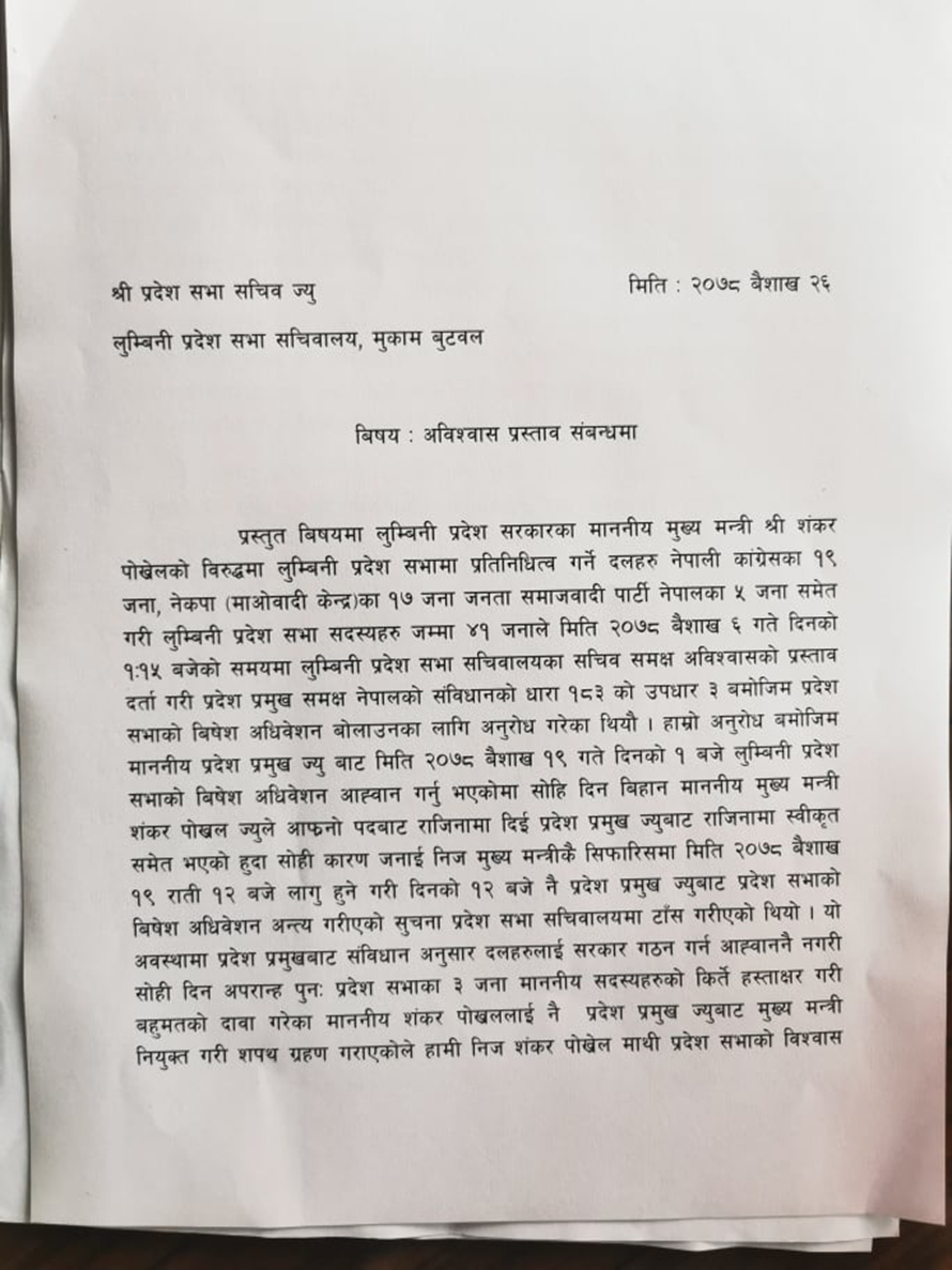 लुम्बिनी प्रदेशका मुख्यमन्त्रीविरुद्ध पुनः अविश्वासको प्रस्ताव दर्ता