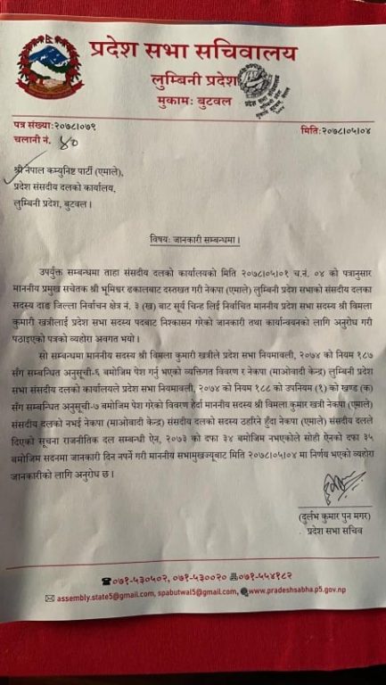 प्रदेशसभाका सचिव दुर्लभकुमार पुन मगरले एमालेलाई पत्र पठाउँदै सांसदद्वय अजय शाही र विमला खत्री वलीलाई पदमुक्त गर्ने आधार नभएको भन्दै कारवाही प्रक्रिया कार्यान्वयन हुन नसक्ने प्रस्ट पारेको हो ।
