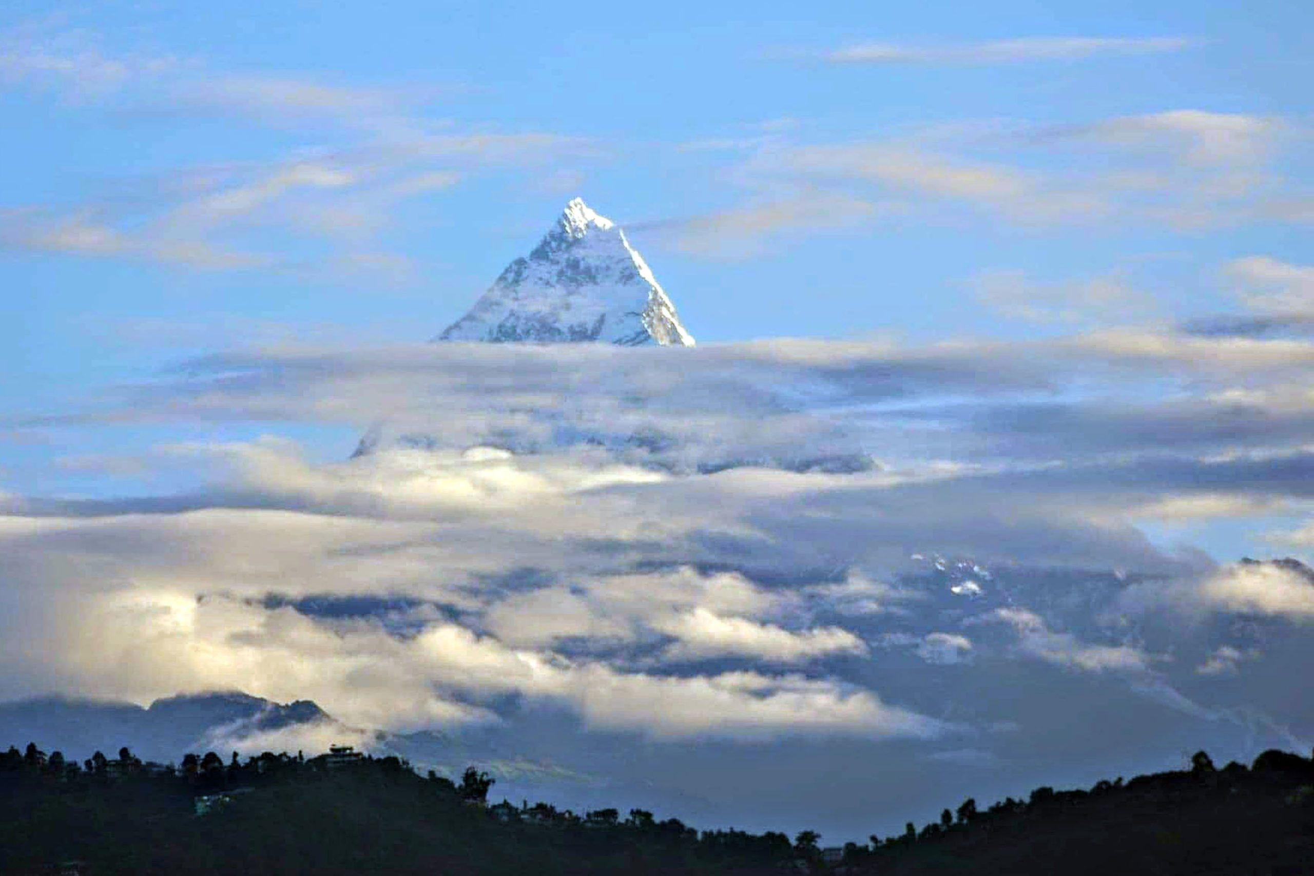 पोखरा – पोखरा महानगरपालिका–१८ सराङ्कोटबाट मङ्गलबार बिहान मौसम खुलेपछि देखिएको माछापुच्छ्रे हिमाल । तस्बिरः राधिका कँडेल/रासस