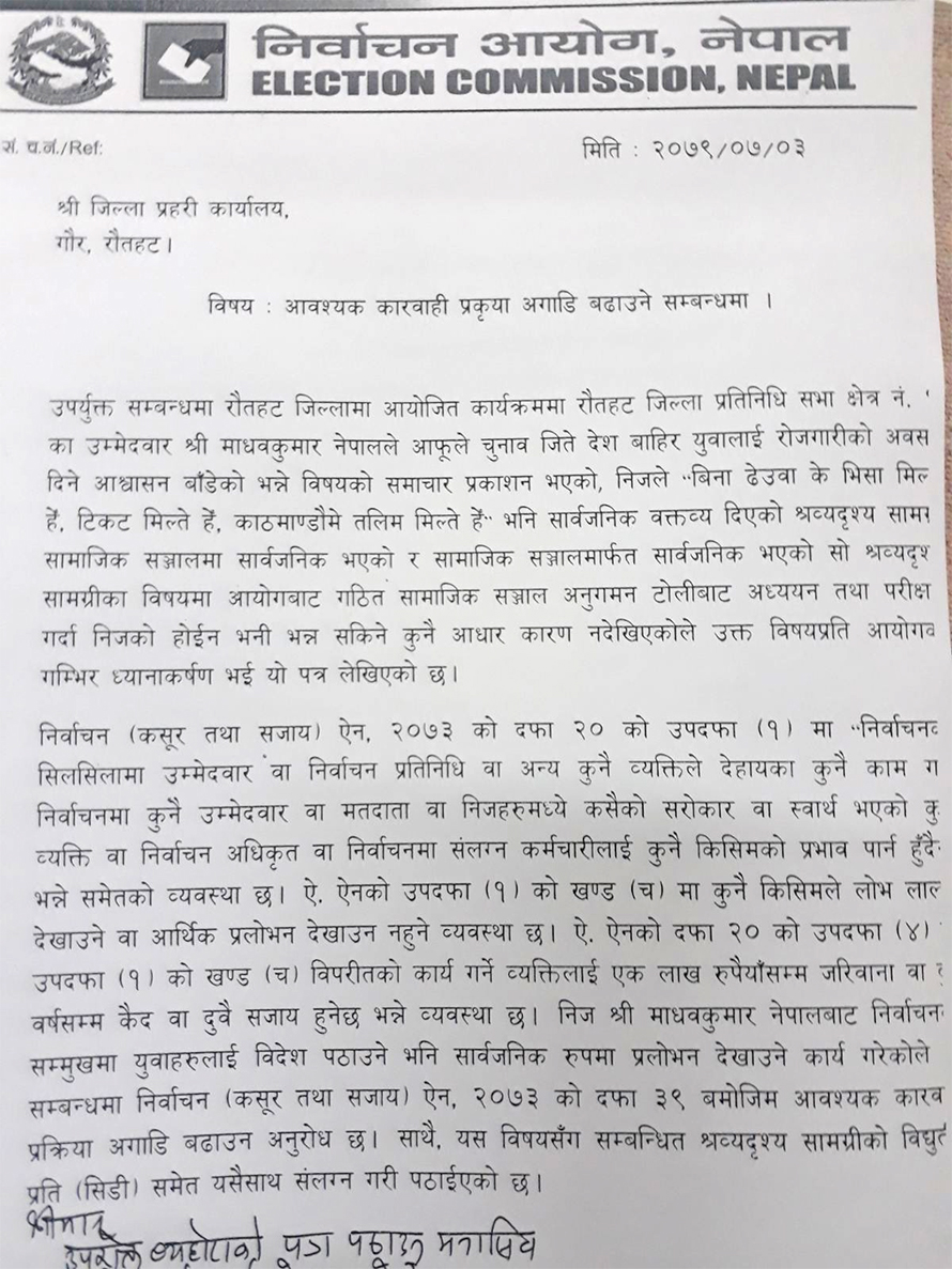 आयोगले निर्वाचन प्रभाव पार्ने कसुर गरेको भन्दै निर्वाचन कसुर तथा सजाय ऐन २०७३ को दफा ३९ अनुसार कारबाही प्रक्रिया अघि बढाउन रौतहट प्रहरीलाई निर्देशन दिएको हो । नेता नेपाल रौतहट क्षेत्र नम्बर १ का उम्मेदवार हुन् ।