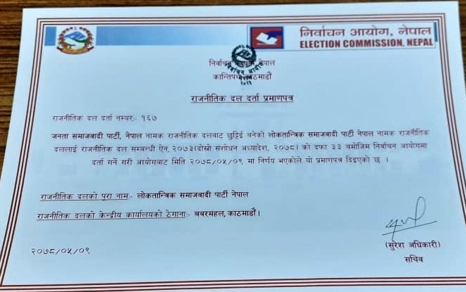 एमालेका ५५ सांसदले नेकपा एकीकृत समाजवादी र जसपाका १४ जना सांसदले दर्ता प्रक्रियामा सनाखत गरेर लोसपा दल दर्ता गराएका हुन् । बुधवार निर्वाचन आयोगले नयाँ दलको रूपमा यी दुई राजनीतिक दललाई आधिकारिकता दिने निर्णय गरेसँगै नयाँ पार्टीले प्रमाणपत्र पनि पाएको छ । आयोगमा लोसपाको दर्ता नम्बर १६७ रहेको छ ।