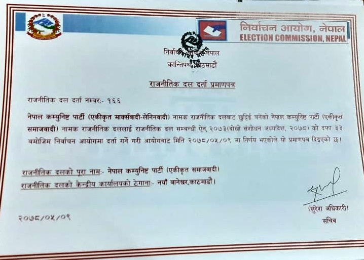 काठमाण्डु – निर्वाचन आयोगले नेकपा एकीकृत समाजवादी र लोकतान्त्रिक समाजवादी पार्टी (लोसपा)लाई राजनीतिक दलको मान्यता दिएको छ । माधवकुमार नेपाल नेतृत्वको नेकपा एकीकृत समाजवादी र महन्थ ठाकुर नेतृत्वको (लोसपा) लाई निर्वाचन आयोगले बुधबार दलको मान्यता दिएको हो ।