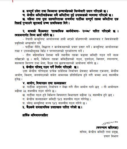 केन्द्रीय कमिटी तथा प्रचार विभाग प्रमुख जगन्नाथ खतिवडाले पार्टीको आज सम्पन्न पहिलो केन्द्रीय समिति बैठकले विभिन्न ५ शिर्षकमा गरेको निर्णयहरु सार्वजनिक गरेका हुन् ।
