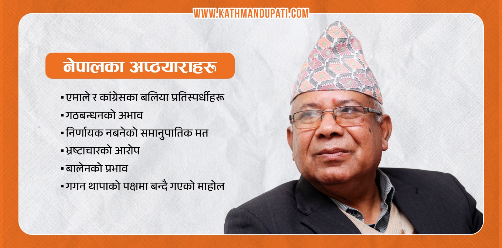 यसपटक उनले २०७९ को निर्वाचनजस्तो सहज प्रतिस्पर्धा सामना गर्नुपर्ने अवस्था छैन । अघिल्लो निर्वाचनमा नेपाली कांग्रेससहितको पाँचदलीय गठबन्धनको समर्थनका कारण सजिलै विजयी भएका नेपाल यसपटक पनि आफ्नो राजनीतिक विरासत कायम राख्ने अपेक्षासहित मैदानमा उत्रिएका छन् ।