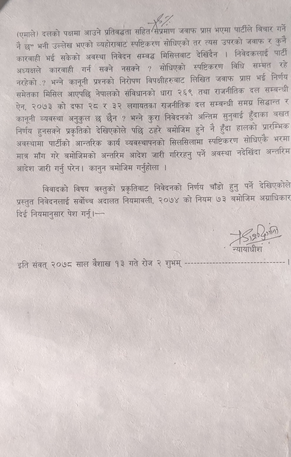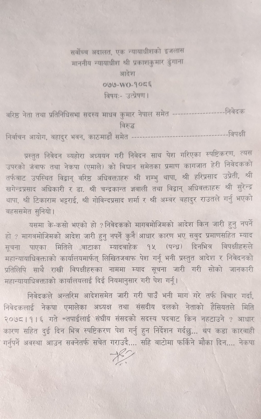साथै अदालतले १५ दिनभित्र प्रधानमन्त्री तथा एमालेका अध्यक्ष केपी शर्मा ओली, सभामुख अग्नी सापकोटा, निर्वाचन आयोग, एमालेका महासचिपव ईश्वर पोखरेल र संसद सचिवालयलाई लिखित जवाफ बुझाउन आदेश दिएको छ ।