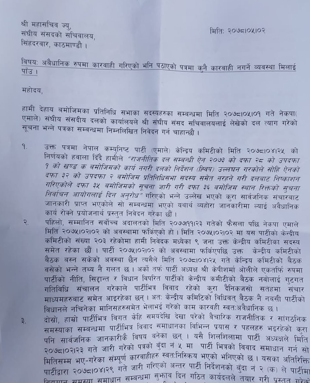 काठमाण्डु – नेकपा एमालेको माधव नेपाल समूहले आफूहरुमाथि गरिएको कारबाही रोक्न माग गर्दै संसद सचिवालयमा पत्र दर्ता गरेको छ ।