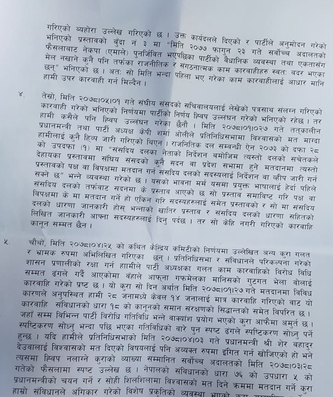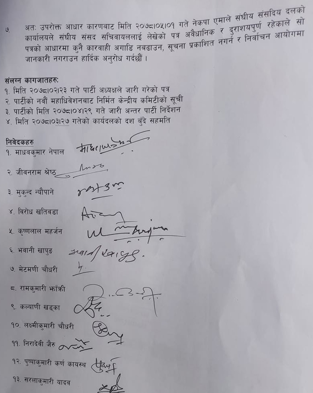 एमालेले आफ्ना १४ जना सांसदहरुमाथि गरेको कारबाही रोक्न माग गर्दै नेपाल समूहले संसद सचिवालयमा पत्र दर्ता गरेको हो । पत्रमा अध्यक्ष केपी शर्मा ओलीले गरेको कारबाही अवैधानिक रहेको उल्लेख गरिएको छ ।